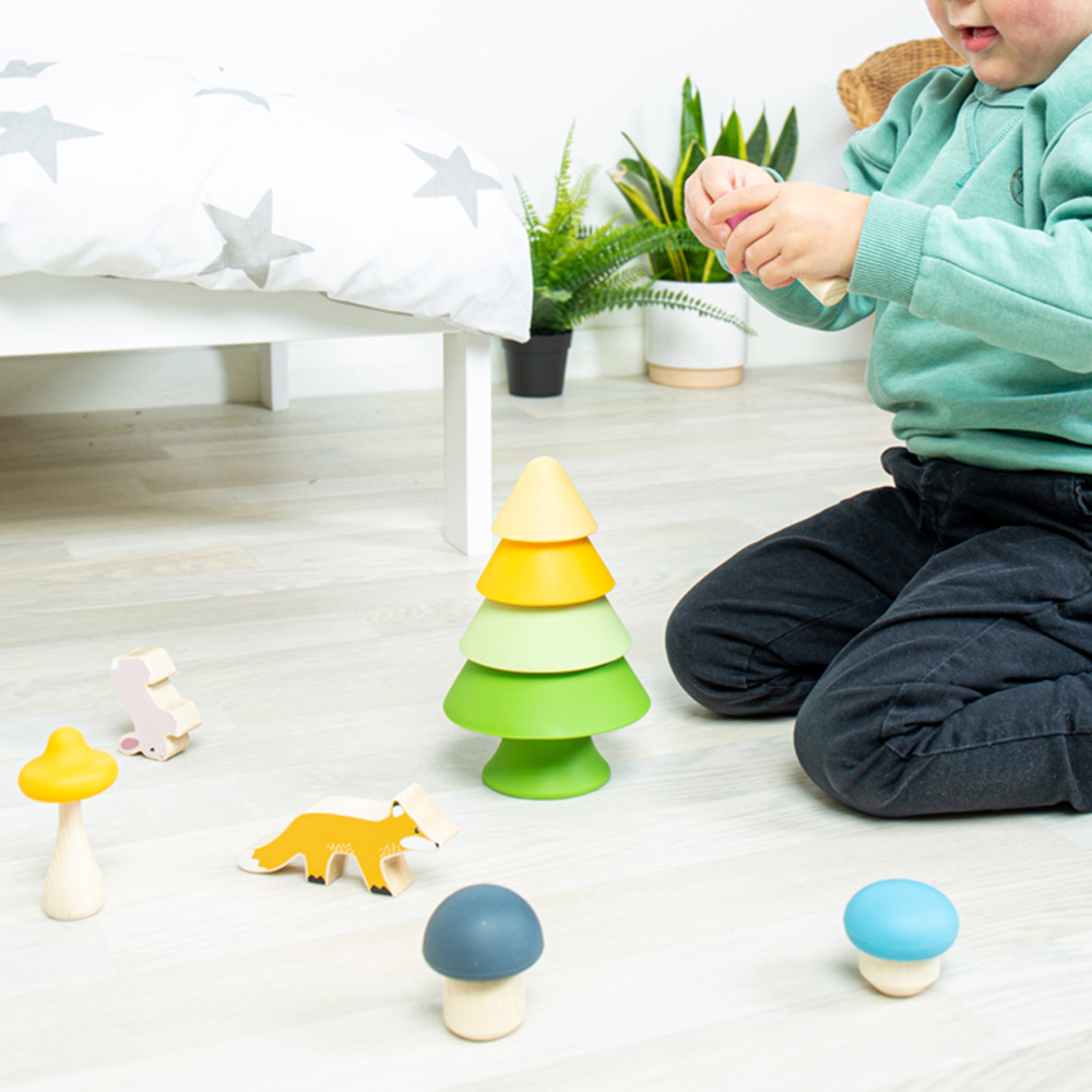 Create enchanted woodland scenes with this Forest Friends Playset from Bigjigs Toys. This playset features four mushrooms, a colourful stacking tree, a wooden bunny and a fox. Montessori wooden toys are brilliant for encouraging open-ended play, which is super important in early childhood development. They give kids the freedom to let their imaginations run wild while boosting their language and storytelling skills. This set is also perfect for planet-friendly playrooms, as they are made with zero plastic - just sustainable silicone and FSC-certified wood. Suitable for ages 12 months and above.