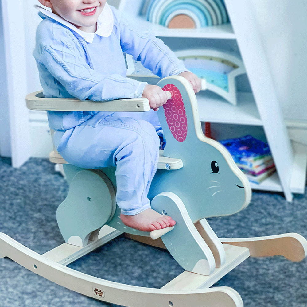 Surprise your little one with endless fun with this Bigjigs Toys Certified Rocking Rabbit Blue. This soft coloured ride on toy is made from sustainable, responsibly sourced wood from Certified forests. Coloured with non-toxic paints and lacquers - it conforms to current European safety standards. The safety guard can be adjusted to meet the needs of your growing infant. Perfect for developing your little ones balance, coordination and to strengthen little legs - it comes with wooden stirrups for extra stability and neutral colours that are suitable for both little boys and little girls. Suitable for children aged 18 months and above, it is the ideal rocking toy for toddlers.