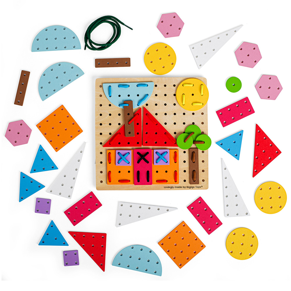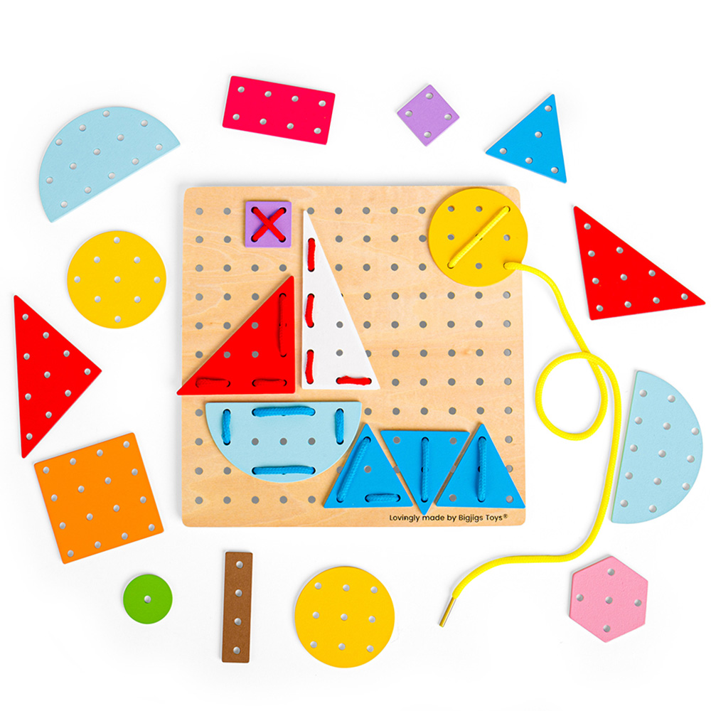 Encourage creative play with the Bigjigs Toys Geometric Lace-A-Shape Game. In this game, little fingers can thread the laces through the shapes and onto the baseboard to create imaginative geometric designs. Wooden threading toys are a fun way to develop kids’ hand-eye coordination, fine motor and sequencing skills. Perfect for toddlers, this toy features 44 different geometric shapes and six different coloured laces. Youngsters need to simply thread the laces through the shapes and onto the baseboard to create a picture. The toy is made from high-quality, responsibly sourced materials and conforms to current European safety standards. Also, the laces are high in quality and safe for tots to use. Suitable for three years and above.