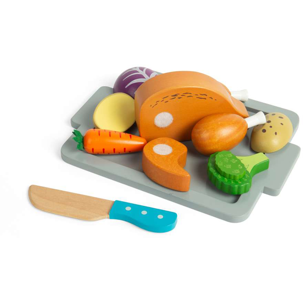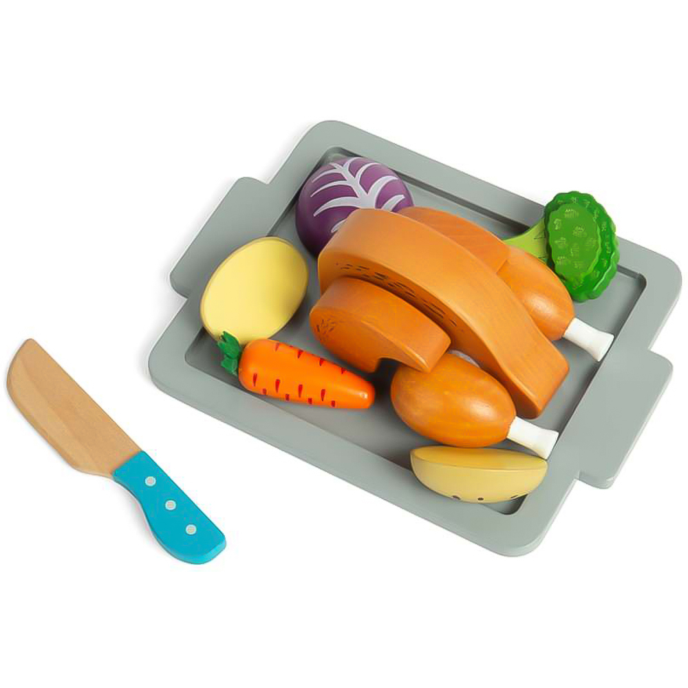 Feast on crunchy carrots, fresh broccoli, crispy potatoes, and succulent chicken with this tempting Roast Dinner Set! Inspiring real-life play sessions, the set comes with a wooden knife, which children can use to carve the chicken thighs and drumsticks, attached with a knife for easy slicing. It also includes a wooden tray, so little chefs can serve their lovingly cooked meals to family and friends. Culinary role play can bring fun and familiarity to foods that kids might not particularly enjoy at mealtimes, reducing fussiness and encouraging healthy eating habits. This style of play is also a brilliant way to nourish children’s imagination, creativity, and social skills. This wooden play food is sustainably made from premium quality FSC certified wood and coloured with non-toxic paints and lacquers. Conforms to current European safety standards. Suitable for 18+ months.