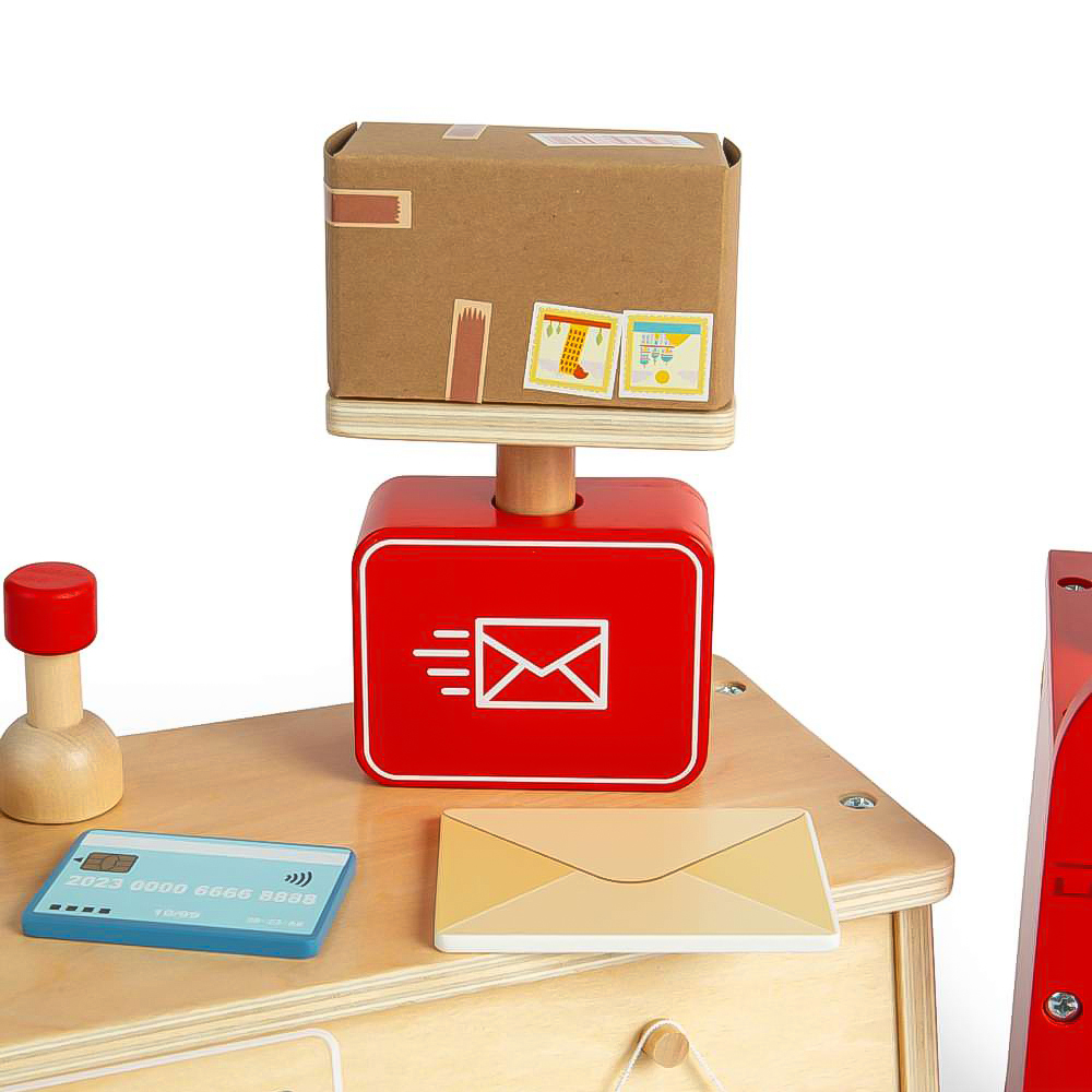 Petite posties can enjoy a busy day sorting and delivering mail with their own Post Office Set! Kitted out with everything children will need for their imaginative play sessions, the set comes with a post box, till station, weighing scales, a chalkboard, parcel sack, parcels, letters, postcards, a stamper, and more. Children's role-play toys are excellent for their social skills and language development. Role-playing as post office employees or customers will also enhance their communication abilities as they practise speaking, listening, reading, and writing. This post office toy is made from premium quality and sustainable FSC certified wood and coloured with non-toxic paints and lacquers. Conforms to current European safety standards. 22cm H x 46.5cm W x 15cm D. Suitable for 3+ years.