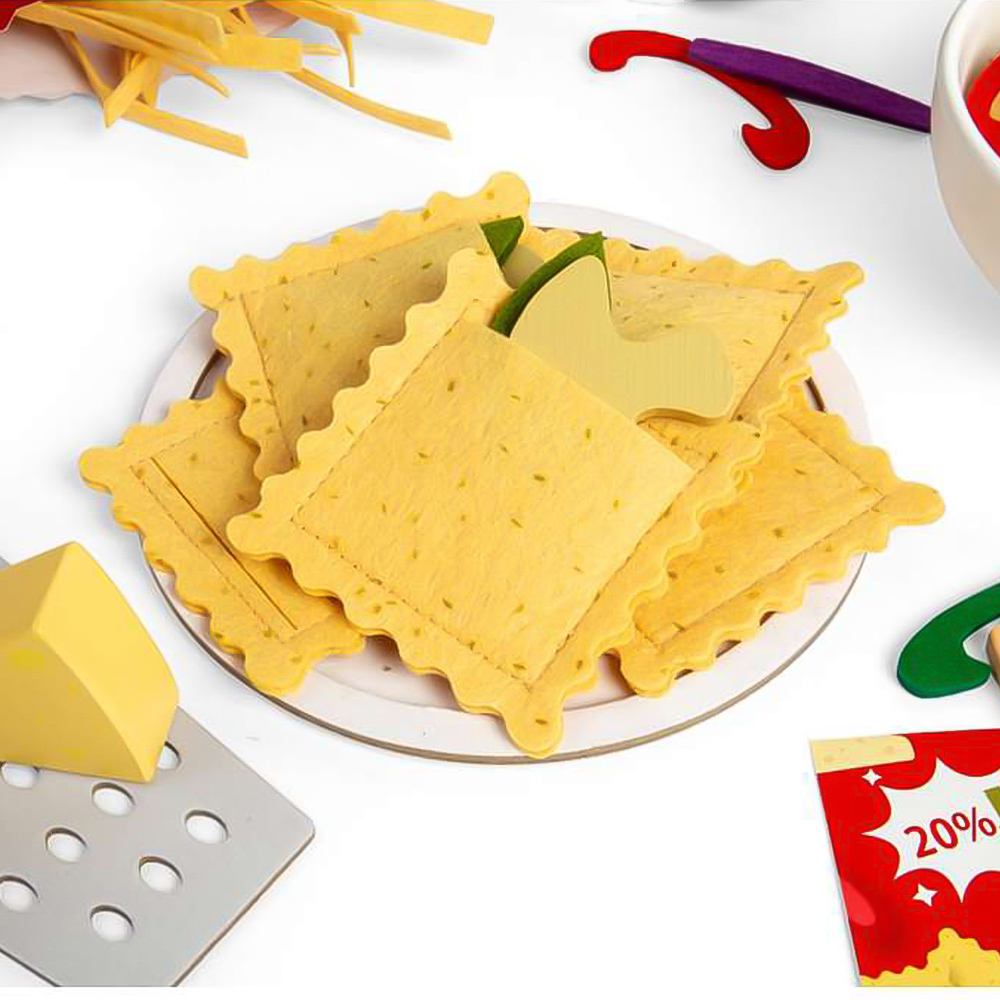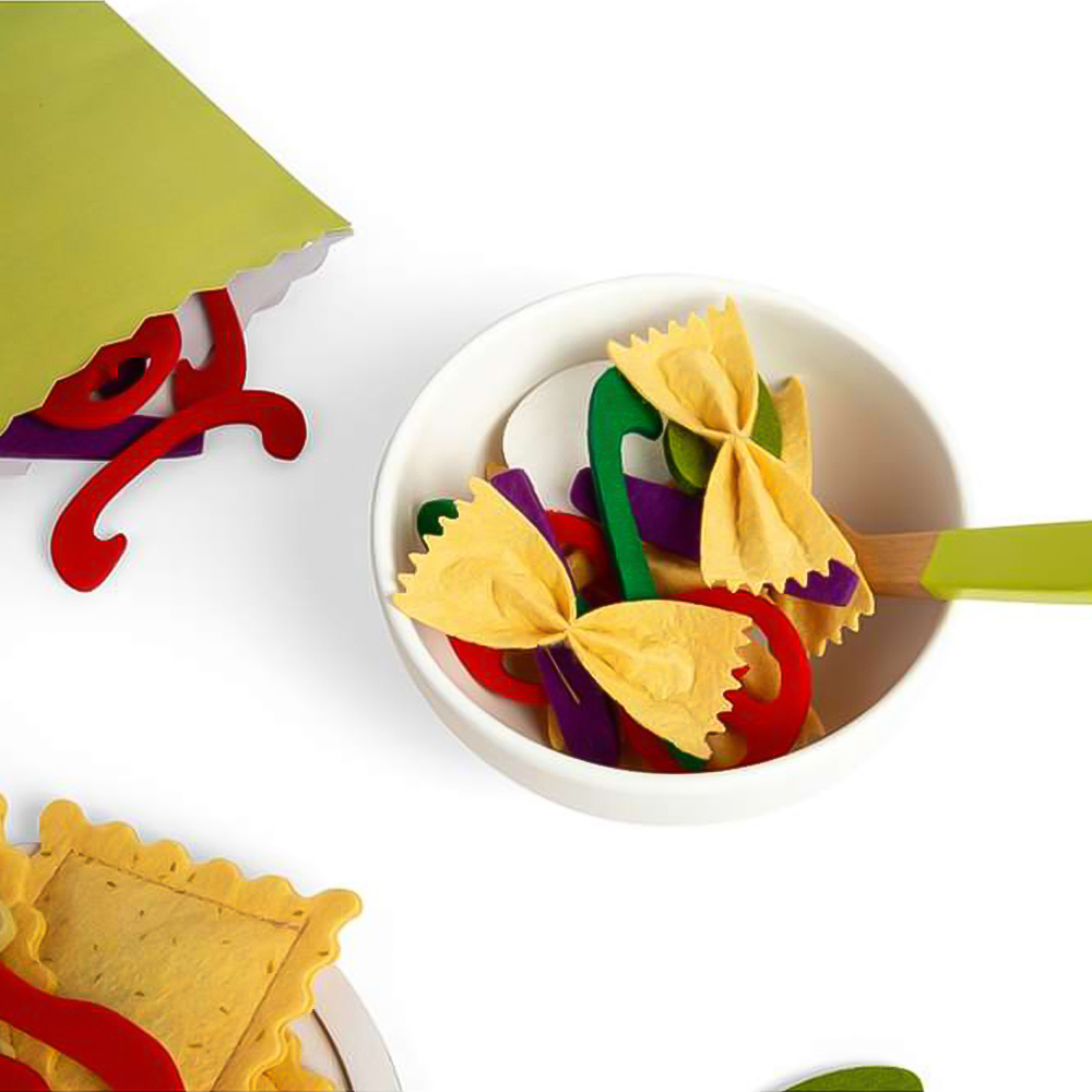 Ignite your children’s culinary imagination with this delizioso Pasta For Two set! This mouthwatering 64-piece toy food set includes a wooden bowl and plate, two forks, a cheese grater with a parmesan wedge, soft felt ingredients like tagliatelle, ravioli, and farfalle, plus a variety of colourful veggies, tomato sauce, and basil leaves. It also comes with an Italian menu for an authentic restaurant experience. Toy food is a perfect way to encourage learning through play. As children prepare, serve, and share their pretend pasta dishes, they’ll develop essential skills. The set is also suited to collaborative play, helping to improve children’s social skills as they learn to communicate and engage in conversation with their dining companions or fellow chefs! This play food pasta set is made from premium quality and sustainable FSC certified wood and coloured with non-toxic paints and lacquers. Conforms to current European safety standards. 6cm H x 17cm W x 14cm D. Suitable for 18+ months.
