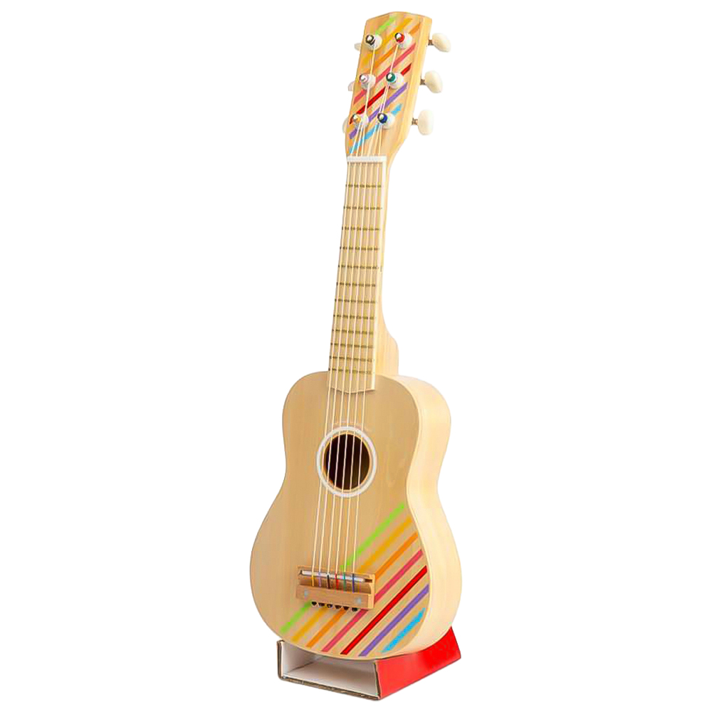 Inspire your little one's musical journey with the Bigjigs Toys Wooden Kids Guitar, perfectly crafted for budding musicians. This acoustic baby guitar, with its six tunable nylon strings, mirrors the authentic experience of playing a real guitar but is designed with little hands in mind. It comes complete with a plectrum for strumming and is made from durable, sustainably sourced FSC-certified wood. The rainbow-striped design adds a touch of fun, making it not only a tool for developing rhythm and timing skills but also a delightful addition to any child's playtime. Suitable for children aged three and above, this guitar ensures safety as it conforms to current European safety standards.