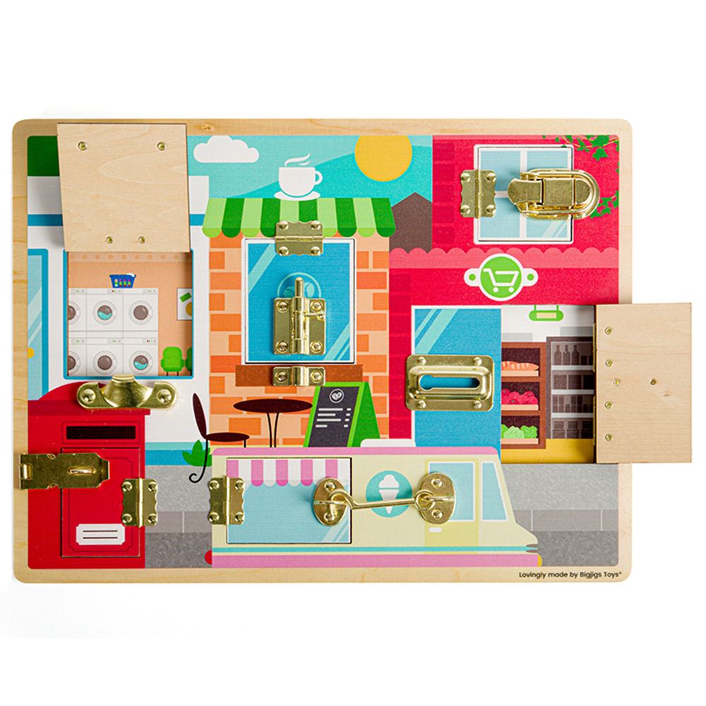 Keep your tots occupied with the Bigjigs Toys Latches and Catches Board. Little hands can learn how to use the different fixtures, such as a toggle catch, a bolt, hinges, a chain slide lock, a padlock hasp, a turn latch, and a hook and eye latch. Once children have mastered opening the different locks, behind each door of this Montessori-style activity board is a detailed scene. Prepare to unveil a laundrette, a cafe kitchen, a cosy lounge, a sack of mail, supermarket shelves, and the inside of an ice cream van. Montessori toys help kids to develop their motor skills, hand-eye coordination and dexterity. Also, safe to use, the playset is made from high-quality, responsibly sourced materials. Suitable for ages two years and above.