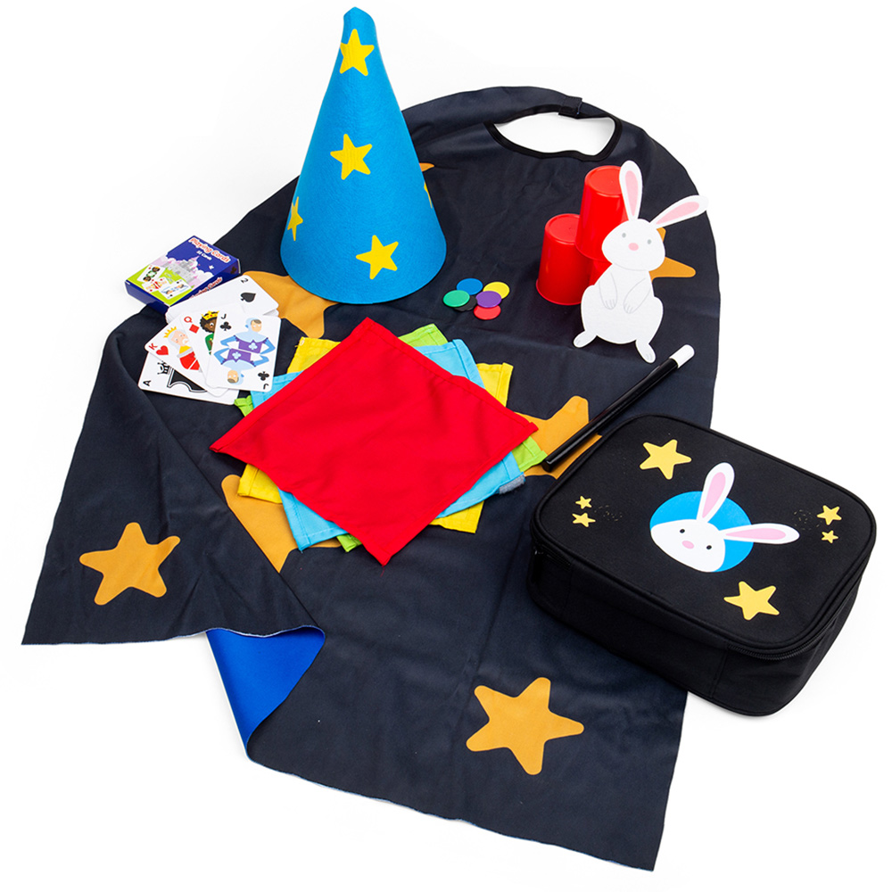 Abracadabra! Mini magicians can wow audiences with their bag of tricks thanks to Bigjigs Toys Magician Set. Let your little one mesmerise friends, families, teddies and dolls with their favourite magic tricks. This magic toy set includes a magician’s bag, star-print cape, wooden wand, cups, felt hat, felt rabbit, six plastic counters and four handkerchiefs. Ideal for everyday fun, pretend play and even parties. Magician toy sets are a whimsical way to improve youngster's confidence, social skills and imagination as they perform exciting illusions. Suitable for three years and above.