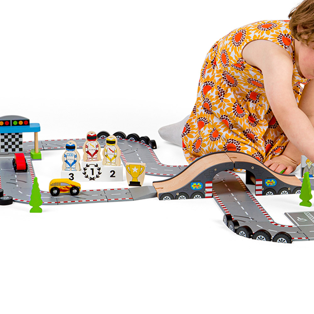 Get ready for an adrenaline-fueled adventure with the Bigjigs Toys Roadway Race Day. With this toy, you can ignite young Formula 1 fans' passion for racing. On the impressive wooden car track, zoom around corners, overtake opponents and reach the finish line. This set comes with three race vehicles, three race car drivers, a podium, a stadium with grandstands, and male and female mechanics. Accessories like cones, traffic lights, barriers, and flags ensure hours of creative play. A standard race track with skid marks, oil spills, and a pit stop is on one side of the double-sided race track, while a dirt track with mud, puddles, and skid markings is on the other. Made from high-quality, responsibly sourced materials, this set guarantees durability.