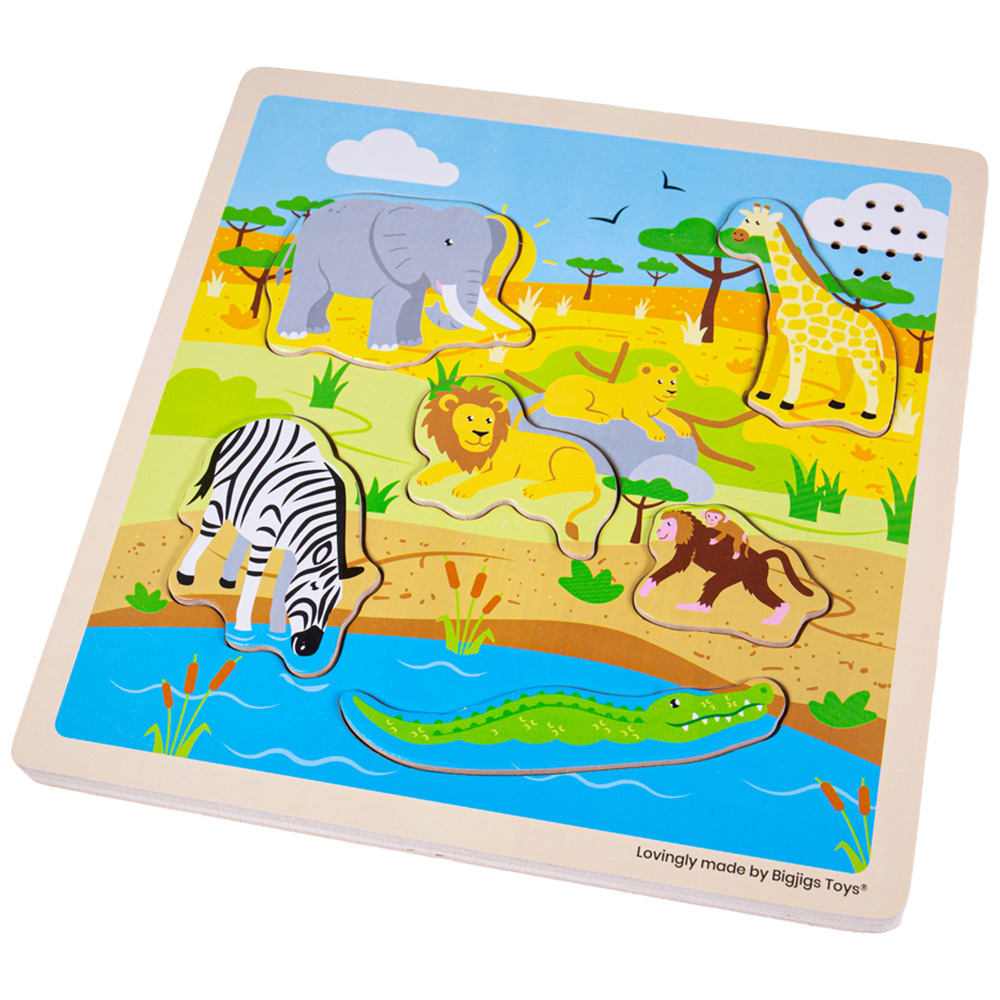 - Includes 6 piece wooden safari sound puzzle