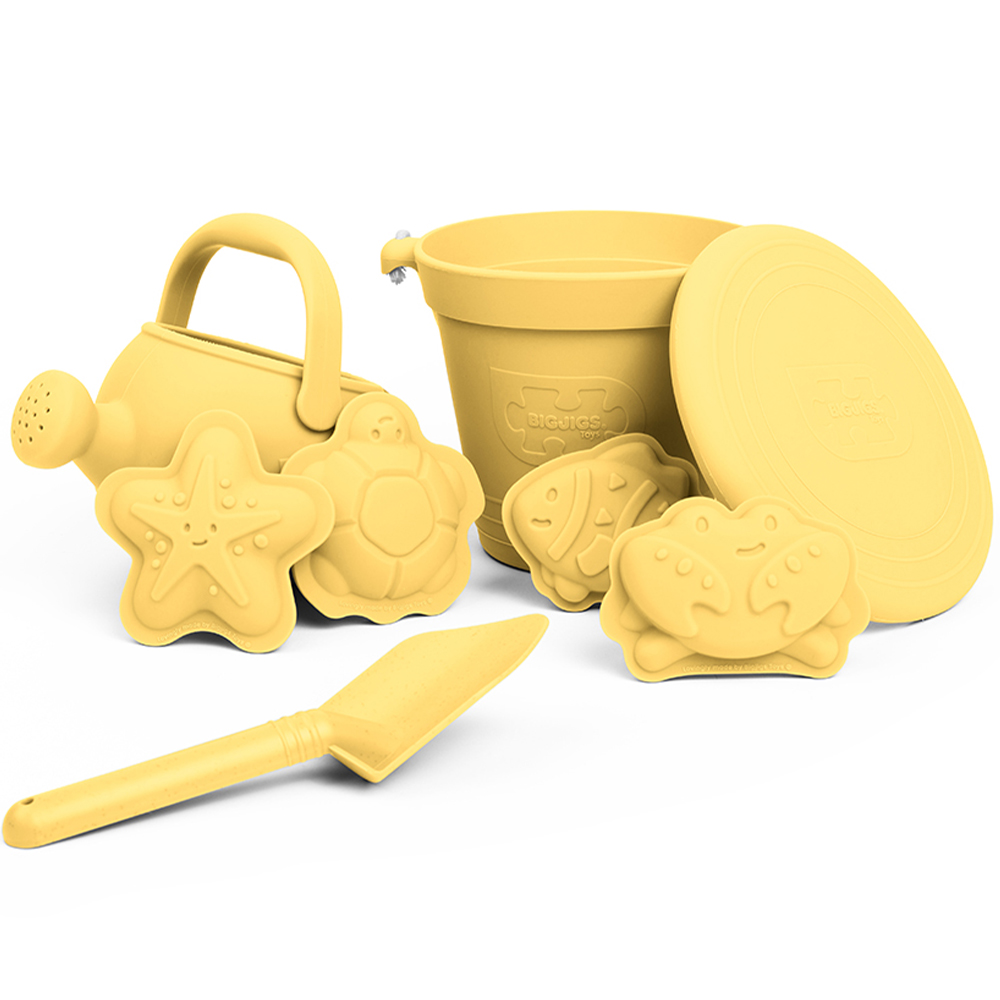 Make most of the outdoors this summer with your little ones with this Bigjigs Toys Silicone Beach Bundle. Made from eco-friendly, food grade silicone - the pack includes activity bucket, eco spade, flexible flyer, watering can and sand moulds. Silicone is flexible, foldable and stain-resistant for convenient cleaning. Made from wheat fibre similar to ABS plastic the spades are tough like plastic, but gentle on the earth. Packaged in brown craft paper - it is suitable for children 18 months and above. Colour: Honey Yellow.