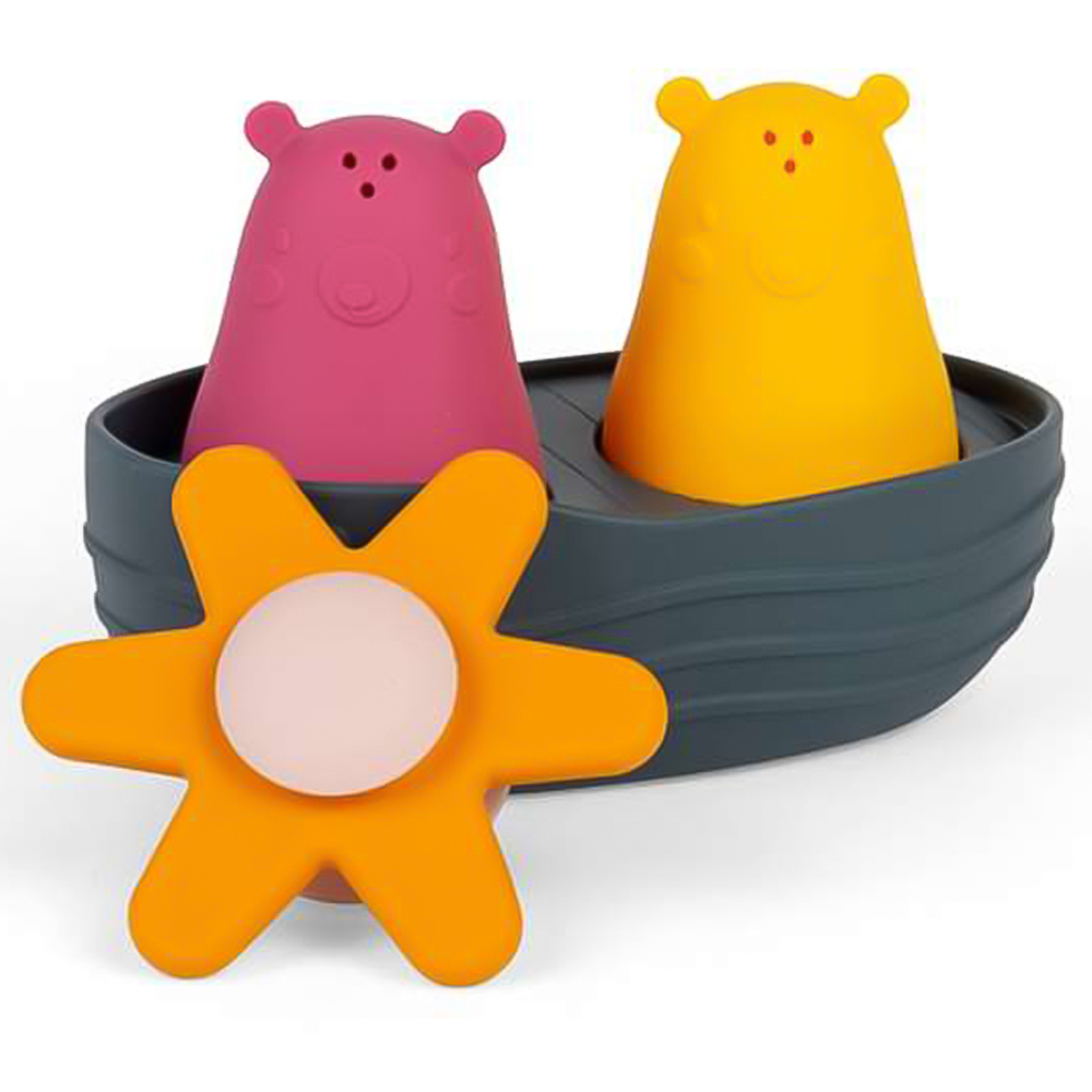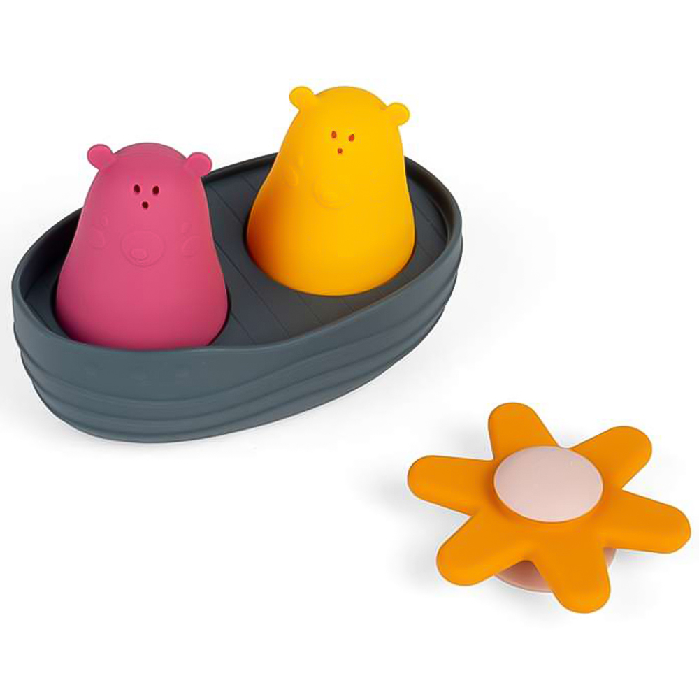 Spin, squeeze, and sail! Made from soft silicone, this action-packed Sensory Bath Set comes with four fidget-friendly water toys designed for playful bathtime adventures. Children can spin the flower wheel, shoot water out of the two bears, and guide the boat along wavy bubble bath seas. Turning everyday bathtimes into aquatic escapades, this silicone bath toys are a fabulous mix of sensory fun and educational discoveries. They spark creativity, improve children’s dexterity and coordination, and introduce tots to the concept of cause and effect through scoop-and-pour play. These toddler bath toys are sustainably made from 100% non-toxic, food-grade silicone. Easy to clean and dishwasher friendly. Conforms to current European safety standards. 11cm H x 16cm W x 9.5cm D. Suitable for 12+ months.