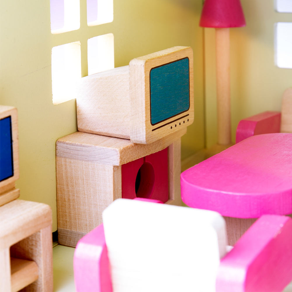Surprise your child with a fun-filled playtime with Bigjigs Toys Wooden Dolls Furniture Set. With 27 pieces of doll house furniture to fully furnish a kitchen, lounge, bedroom and more, these wonderfully detailed wooden pieces will help young imaginations to create enchanting interiors. Crafted from high-quality, responsibly sourced materials - it can sustain years of play and is gentle on little fingers. The bright furniture colours are made using child-friendly, non-toxic paint and lacquers. Note: Fits the Bigjigs Toy Heritage Playset range.