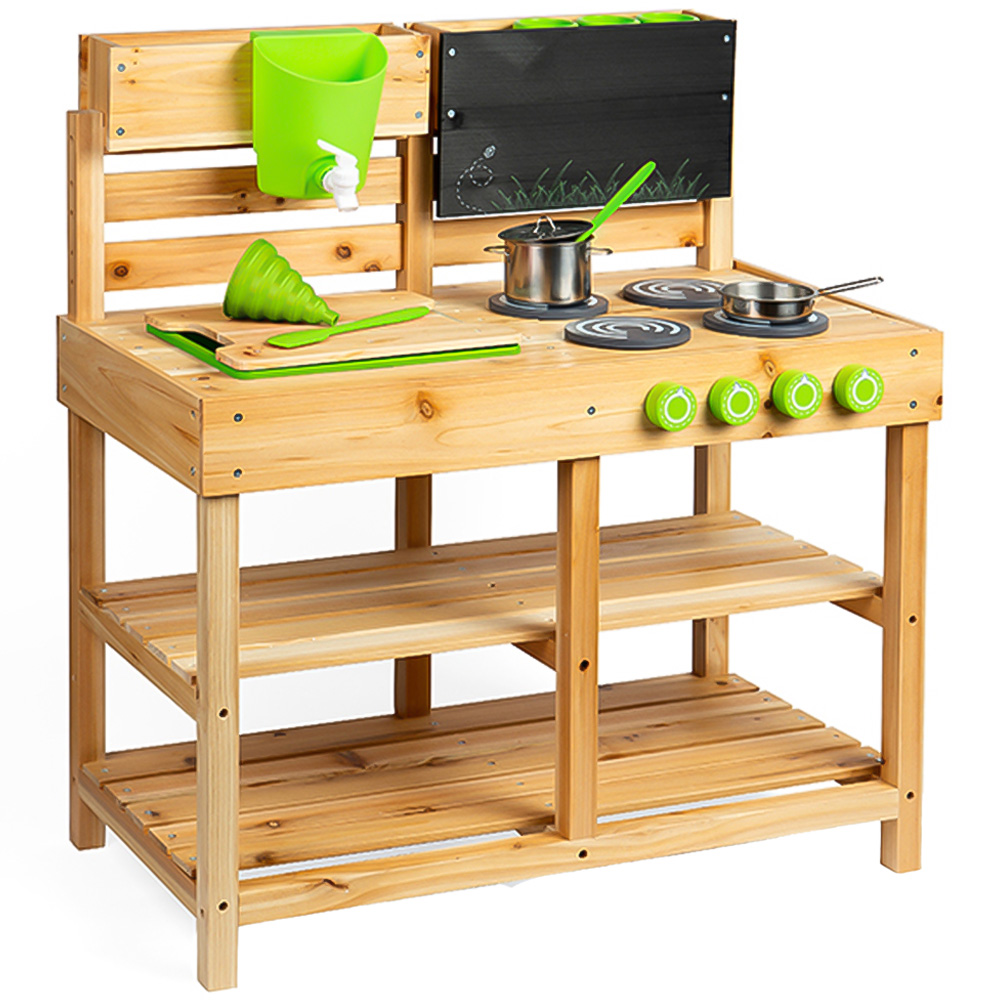 Prepare a picnic of soil sandwiches and mud muffins, rustle up some sensory rainbow spaghetti, or concoct a petal potion! This sustainably-made Bigjigs Toys Wooden Mud Kitchen With Pots & Pans features two shelves and a double worktop with a sink to the left and four hobs to the right. Mucky chefs can write up recipes on the blackboard and filter water through the tap on the yellow bucket. Our marvellous messy kitchen also comes with a bunch of fun mud kitchen accessories, such as stainless steel pots and pans, a small funnel, plant pots, and wooden utensils. Messy play is super important in children’s early years as it fosters curiosity and creativity, motivates open-ended exploration, and supports kids’ sensory development. Wooden garden toys like this kitchen also spark excitement for nature and encourage tots to spend time in the great outdoors! Our kid's Mud Kitchen is made from ethically harvested FSC® Certified wood and coloured with non-toxic paints and lacquers. Conforms to current European safety standards. Suitable for 2+ years.