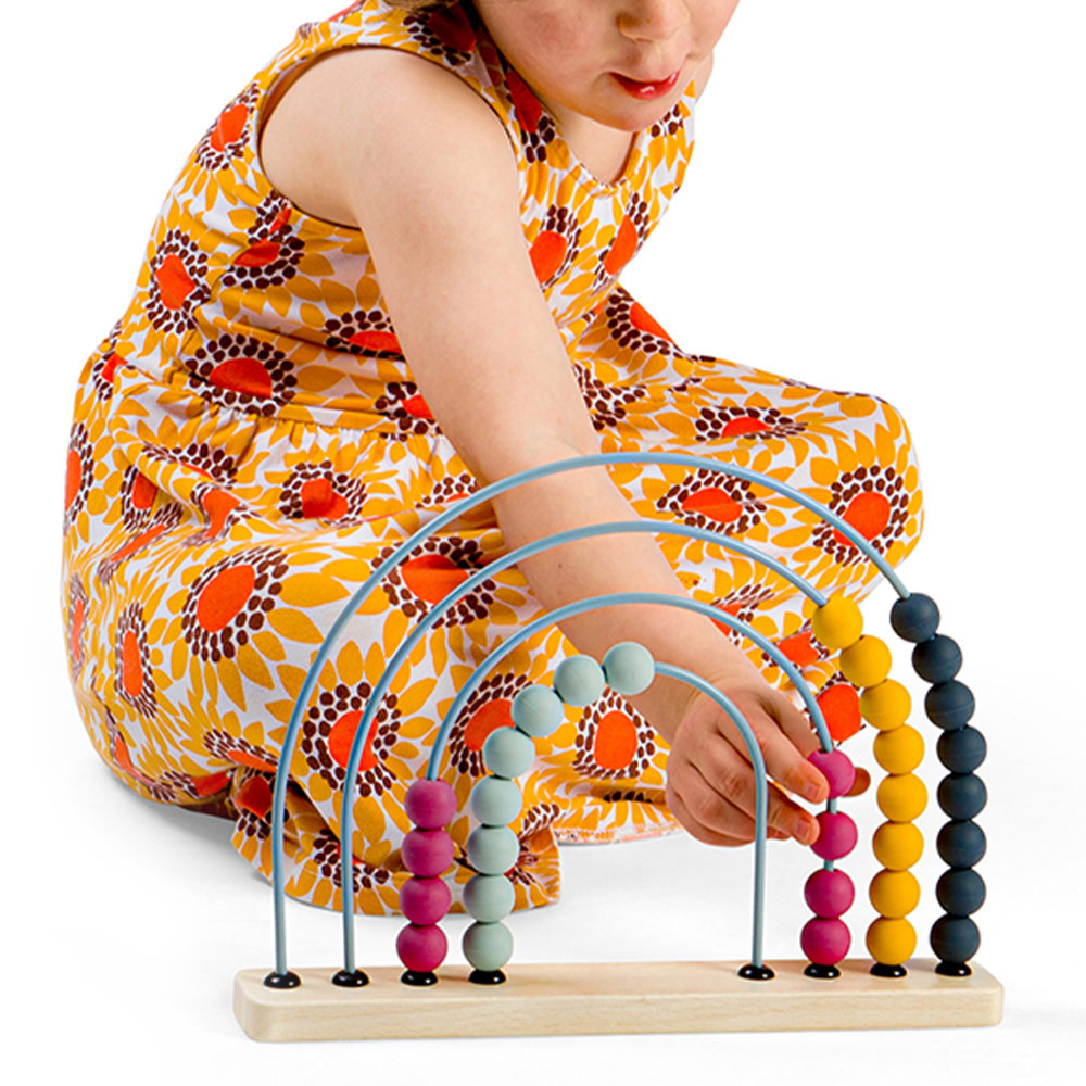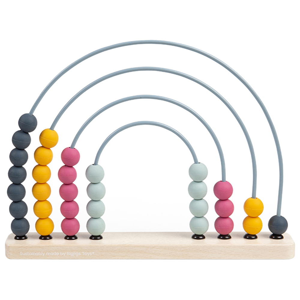 Enjoy eco-friendly playtime with the Bigjigs Toys Wooden Rainbow Abacus. In this toy, little ones can move the silicone beads over each metal arch as they discover the joys of learning to count. This unique rainbow-shaped abacus features a wooden base made from ethically harvested FSC-certified wood, light blue metal arches, and 32 food-grade silicone beads (in soft tones). Ideal for early learners to safely play and explore, this toy is not only educational, but it makes a wonderful piece of nursery decor when playtime is over. The toy is made from high-quality, responsibly sourced materials and food-grade silicone and conforms to current European safety standards. Suitable for ages 18 months and above.