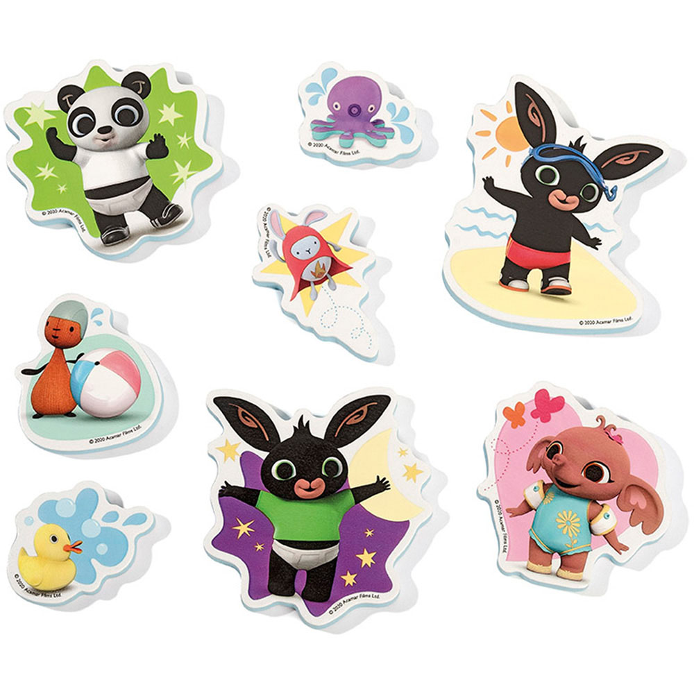 Add a fun splash to your little ones' bath with Bing Bath Figurines. Featuring an eight-piece - this Bing-licensed bath figurine makes bath time a fun experience. Made from EVA foam and once wet - can be stuck onto a tiled surface and will even float on water. They come in a netted storage bag with suckers, so they will always be at hand each bath time. Suitable for ages ten months and above.