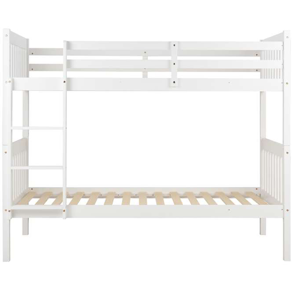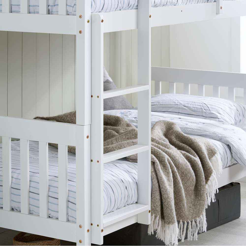 Maximise your child's bedroom space with the Benji Bunk Bed, a durable and stylish solution that combines functionality with a playful design. Crafted from solid wood and finished in a fresh white, this bunk bed not only offers a clean, modern look but also ensures a safe and comfortable sleep environment with its high safety rails and sturdy ladder. The ladder's flexibility to be positioned on either side allows for easy customization to fit various room layouts, making it an excellent choice for shared spaces or sleepovers.