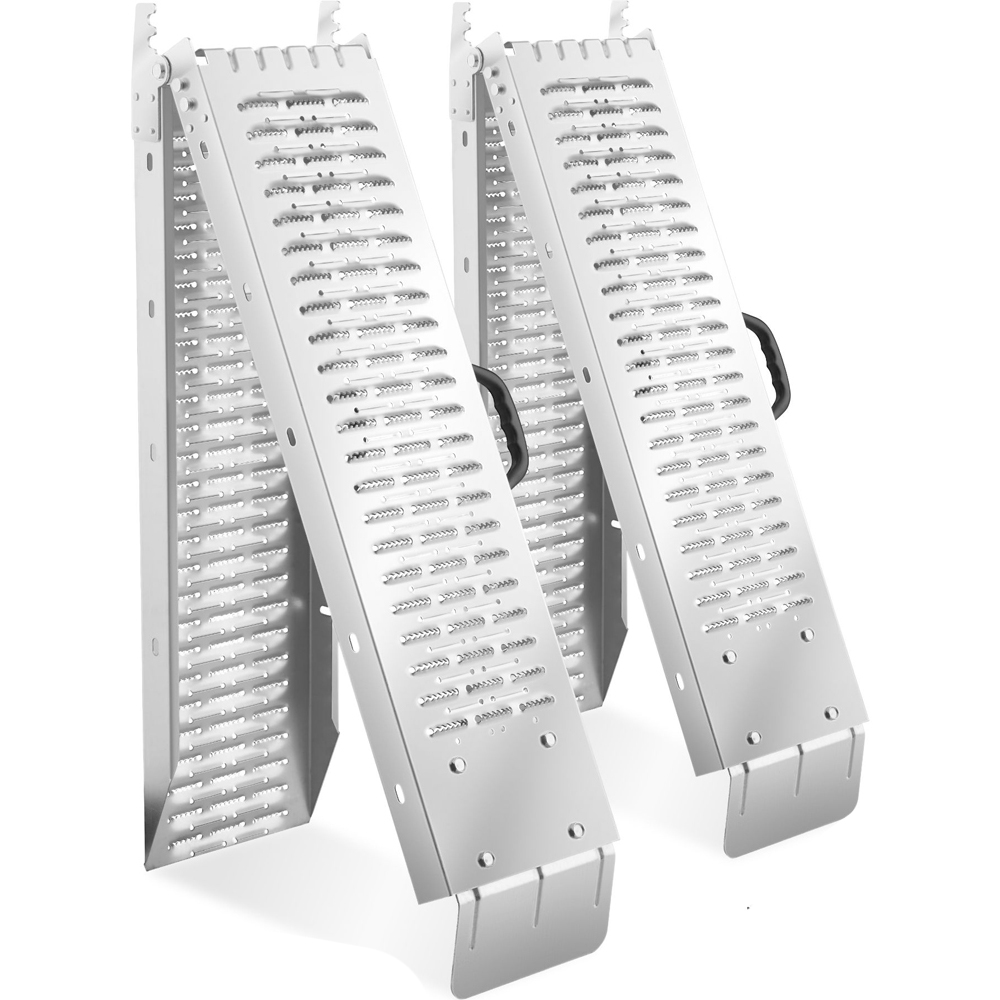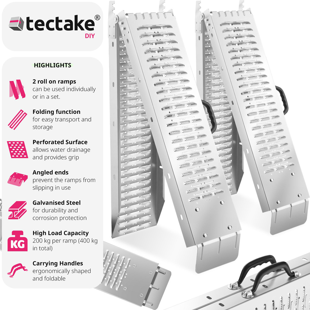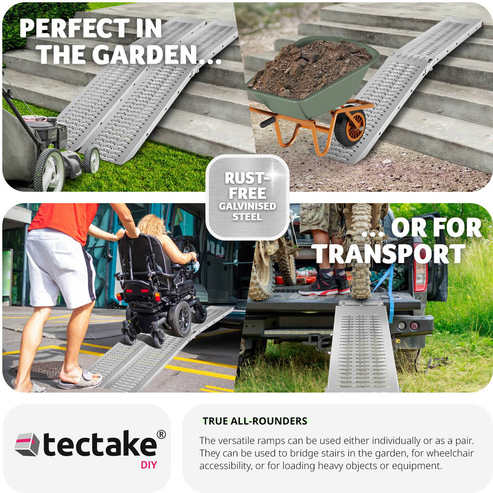 Thanks to the two compact and foldable Bjorn loading ramps from tectake, back pain when loading heavy items is a thing of the past. Equipped with carrying handles and perforated surfaces, and bevelled support ends, the ramps provide excellent grip and drainage, while preventing slipping. They are made from galvanised steel, making the trailer ramps exceptionally sturdy and corrosion-resistant. The high load capacity of the lightweight duo is impressive, making it perfect for loading heavy items, barrier-free passenger transport, and much more. The ramps have a capacity of 200kg each.