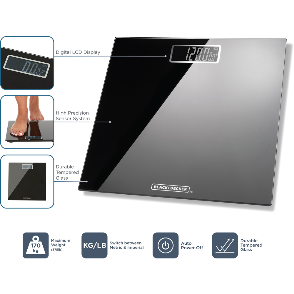 Ensure accurate reading of your weight with this bathroom scale from BLACK+DECKER. Designed in black colour - it features a clear LCD for easy reading. It is built with a sturdy tempered glass platform to ensure durability, comfort, and user-friendliness. The scale has dimensions of 30 x 30cm and is equipped with high-precision sensors that provide accurate weight measurements up to 170kg and 375lb, with weight displayed in both lb and kg units. Additionally, it comes with an auto on-and-off function for convenience. The modern and sleek design of the scale makes it a perfect fit for any room in your home. It operates on 2 x AAA batteries (not included).