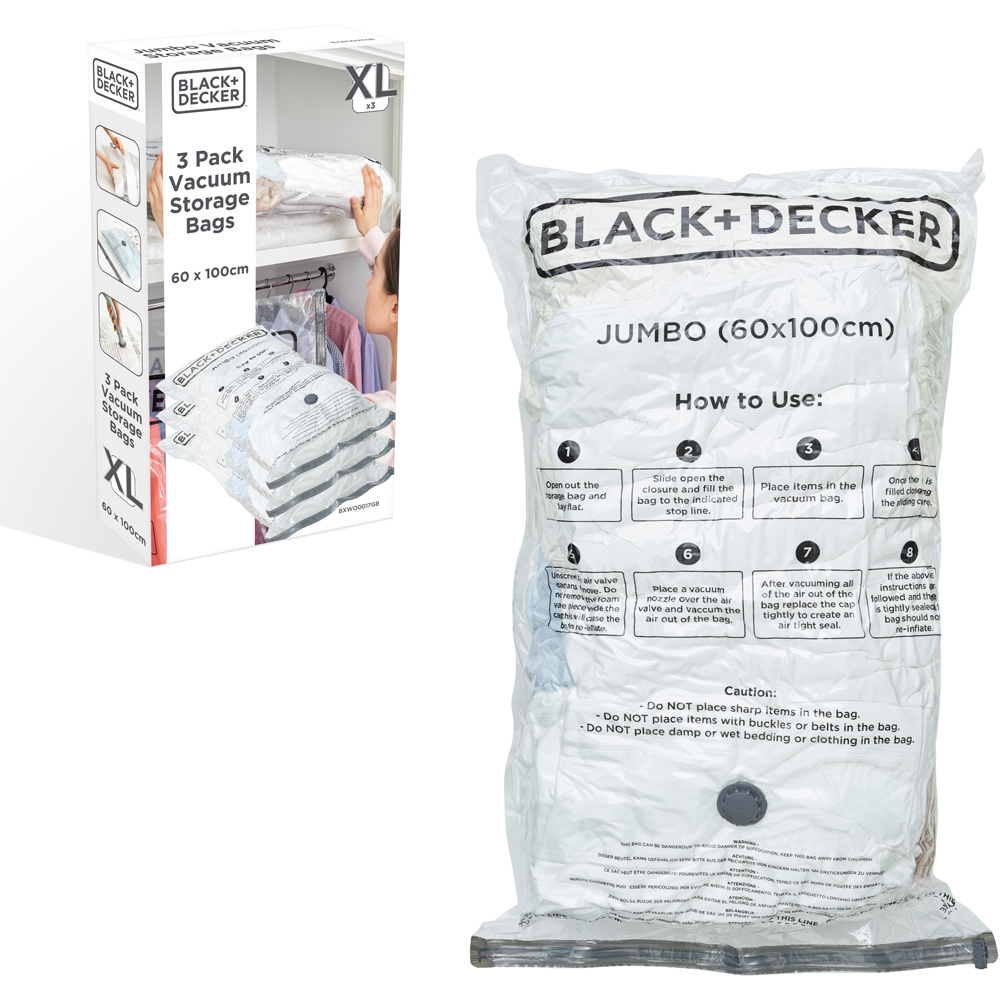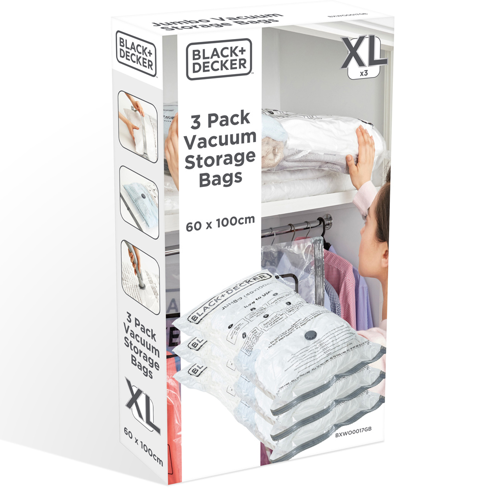 Make a practical and user-friendly storage solution for your home with the Black + Decker Extra Large Vacuum Storage Bag 3 Pack. These vacuum bags can reduce storage requirements by up to 80 percent, while also safeguarding your clothing and belongings from moisture, dust, and other household pollutants. With dimensions of 60 x 100cm, they are ideal for storing bedding, duvets, sheets, and sleeping bags. To use, simply lay the bag flat, fill it up to the designated line, attach a vacuum nozzle to the valve, and remove the air. The vacuum pump valve is compatible with any standard vacuum cleaner nozzle. By using these bags, you can protect your items from moisture, mould, mildew, odours, and dust, while also minimising the amount of storage space needed in your home.