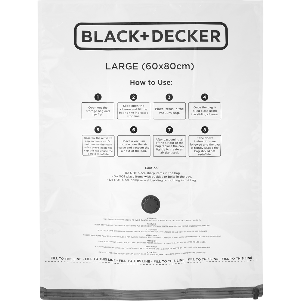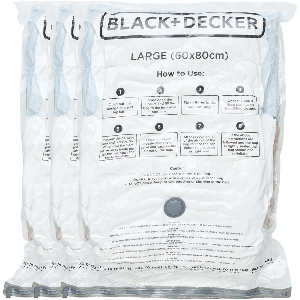 Make a convenient and efficient solution for home storage needs with the BLACK+DECKER Large Vacuum Storage Bag 3 pack. These bags can reduce storage requirements by up to 80 percent and protect against moisture, dust, and other household contaminants. Ideal for storing summer clothes during the winter months, these bags are also perfect for travel as they can easily fit into suitcases or hand luggage, reducing the volume of luggage needed. With dimensions of 60 x 80cm, they are suitable for storing 10 to 12 sweaters, pillows, coats, and more. Simply lay the bag flat, fill it up to the designated line, attach a vacuum nozzle to the valve, and remove the air using a standard vacuum cleaner. This process helps protect your items from moisture, mould, mildew, odours, and dust while minimising the storage space required in your home.