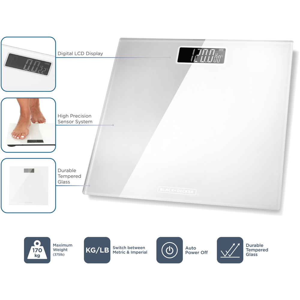 Ensure accurate reading of your weight with this bathroom scale from BLACK+DECKER. Designed in white colour - it features a clear LCD for easy reading. It is built with a sturdy tempered glass platform to ensure durability, comfort, and user-friendliness. The scale has dimensions of 30 x 30cm and is equipped with high-precision sensors that provide accurate weight measurements up to 170kg and 375lb, with weight displayed in both lb and kg units. Additionally, it comes with an auto on-and-off function for convenience. The modern and sleek design of the scale makes it a perfect fit for any room in your home. It operates on 2 x AAA batteries (not included).