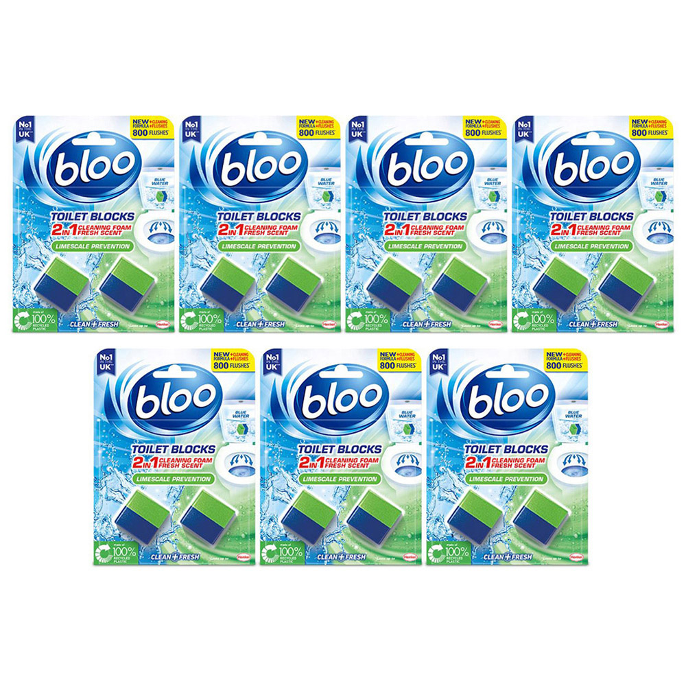A hygienically clean and fresh toilet from the cistern out with every flush! Make your loo the best seat in the house with a long-lasting Bloo toilet block that you can rely on. Bloo in cistern block gets your toilet shining again with cleaning and foaming action, giving you a hygienically clean and fresh toilet from cistern to toilet rim to bowl, with every flush! Bring colour to your bathroom and turn your toilet water blue with Bloo Bluewater technology that actively cleans between flushes! With a concentrated cleaning action designed to prevent limescale, this toilet unblocker range cleans from the cistern to the bowl every time you flush for a long-lasting, hygienic clean. Features: Blue Water Clean + Fresh 2-in-1 Cleaning Foam Fresh Scent Safety Warnings: Contains: Sulfuric acid, mono-C12-18-alkyl esters, sodium salts, Amides, C12-18 and C18-unsatd., N-(hydroxyethyl), Sulfonic acids, C14-17-sec-alkane, sodium salts. Causes skin irritation. Causes serious eye damage. Harmful to aquatic life with long-lasting effects. Keep out of reach of children. Wear protective gloves and eye protection. If Eye contact: Rinse cautiously with water for several minutes. Remove contact lenses, if present and easy to do. Continue rinsing. Box Contains: 7 Pack of Bloo Toilet Rim Blocks Limescale Prevention, 50g.