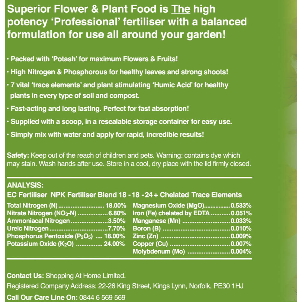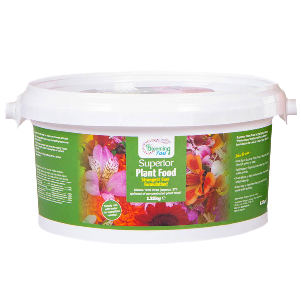 Feed your green friends the best with the wilko Blooming Fast Superior Plant Food. The only fertiliser you need for your garden for more flowers, more fruit, better roots and better shoots. Transform the performance of your plants with regular feeding throughout the growing season. Specially formulated to an exacting recipe, the soluble includes Nitrogen for healthy leaves and shoots; Phosphates to boost the roots; Potash for super flowers, fruit and vegetables; Seven micronutrients vital for healthy plants; Humic Acid for improved biological activity in the root system. It's simple to use - add one 5g scoop, included in the pack, to 4.5 litres of water, and simply water weekly during the growing season. This tub makes up to 250 watering cans full of feed. You will see quick and long-lasting results, and it can be used on all plants except the lawn. Supplied in a 1.25kg tub.
