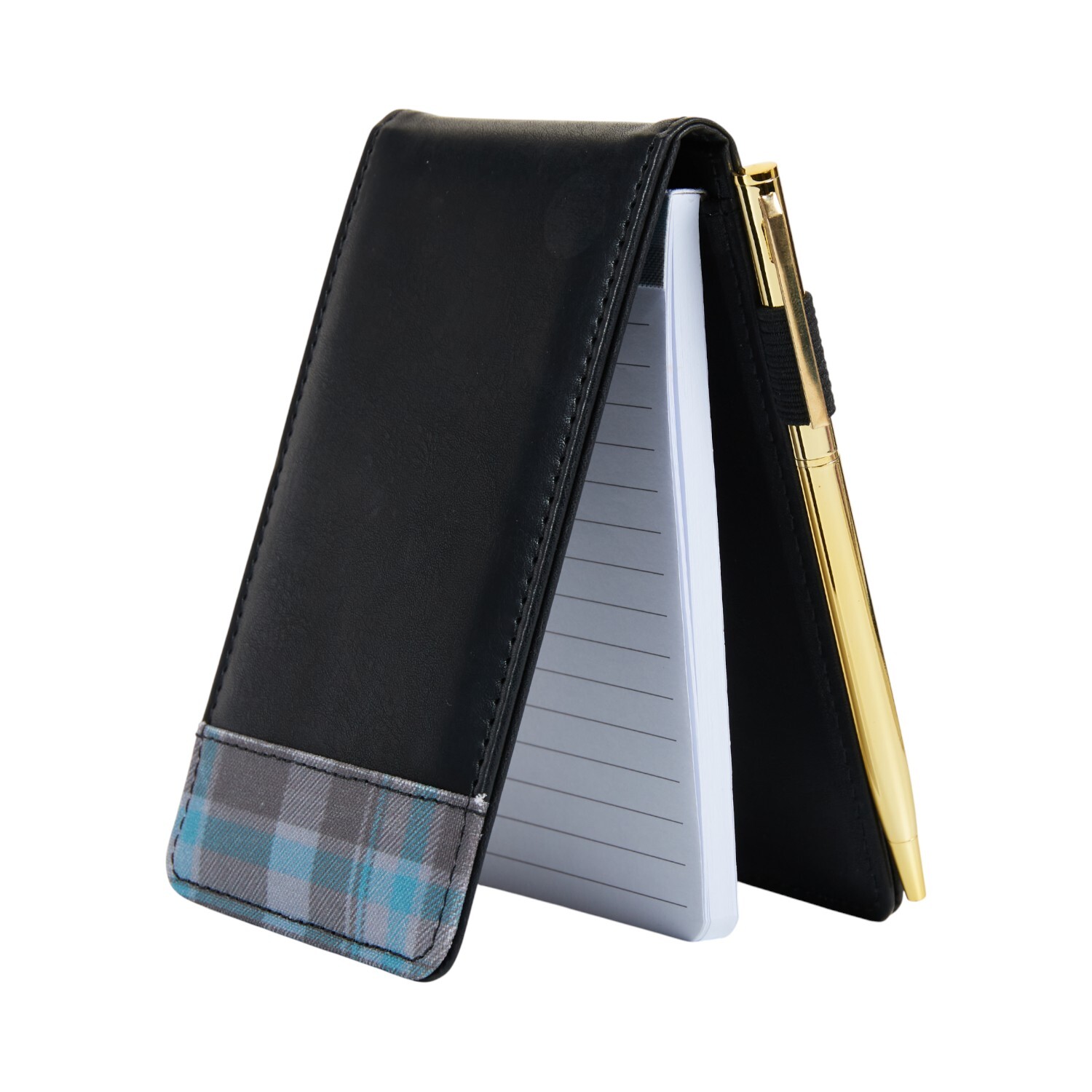 Stay organised in style with the Blue and Grey Tartan Flip Notebook with Pen. Designed with a classic tartan print in cool tones, this compact flip-top notebook is both practical and smart-looking. Ideal for quick note-taking on the go, it comes with a matching pen that slots neatly into the side.