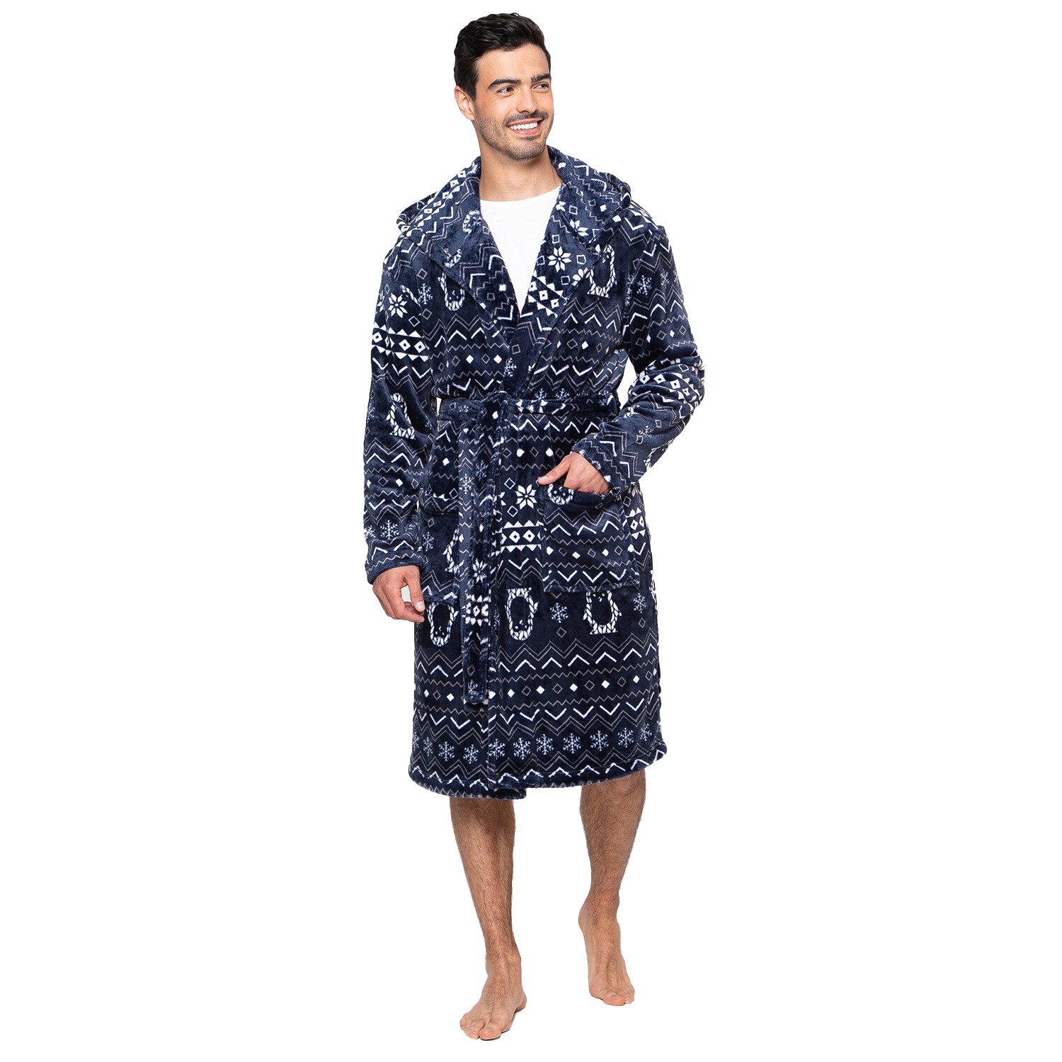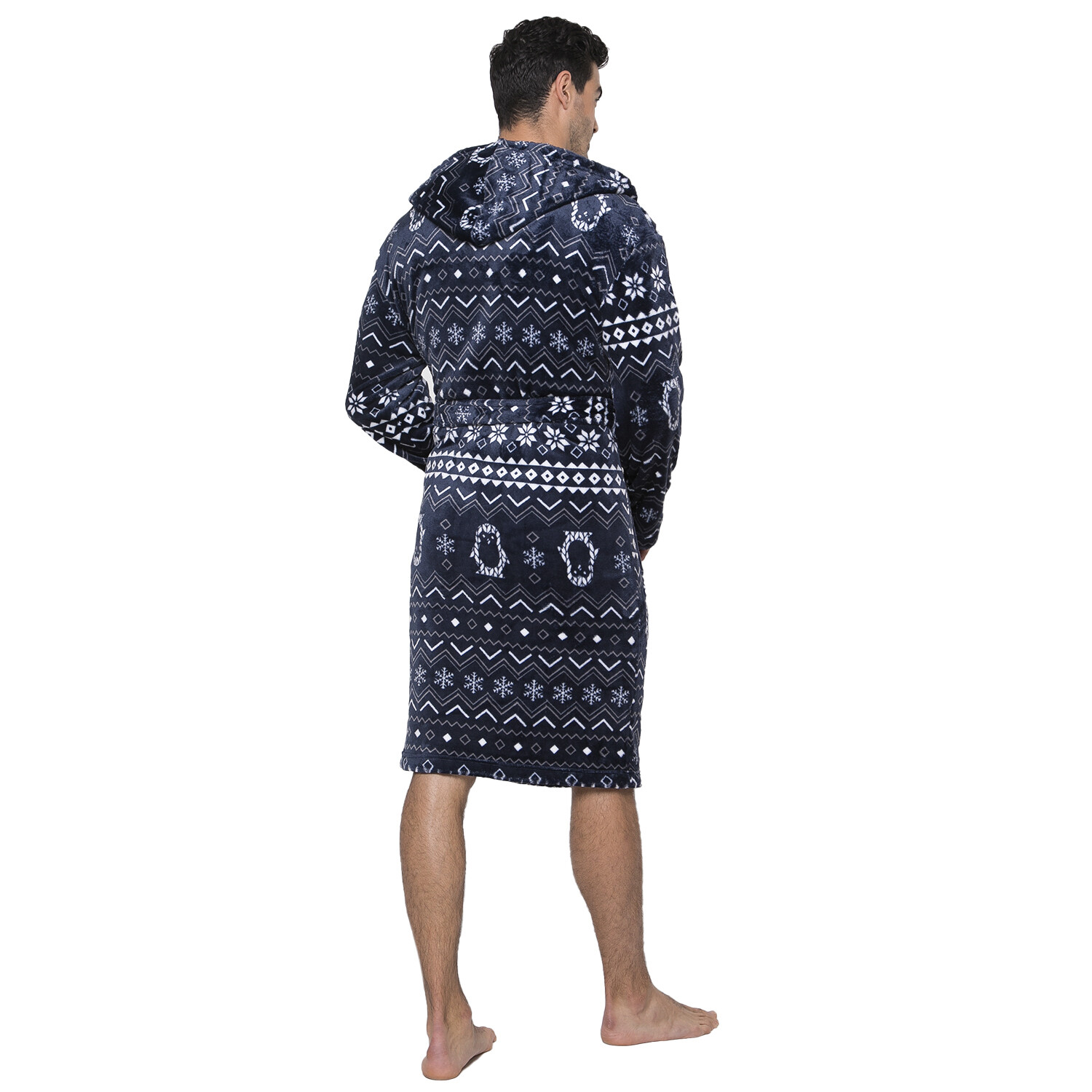 Coloured a deep blue with a white allover pattern, this Mens Blue Penguin Dressing Gown will help you keep warm and comfortable while chilling at home in the winter. Made from 100% polyester, this soft and comfortable dressing gown features a fun pattern of penguins, snowflakes, and geometric rows. A tie-up waist makes for quick and easy securing, while two slip pockets will be perfect for carrying your phone around.