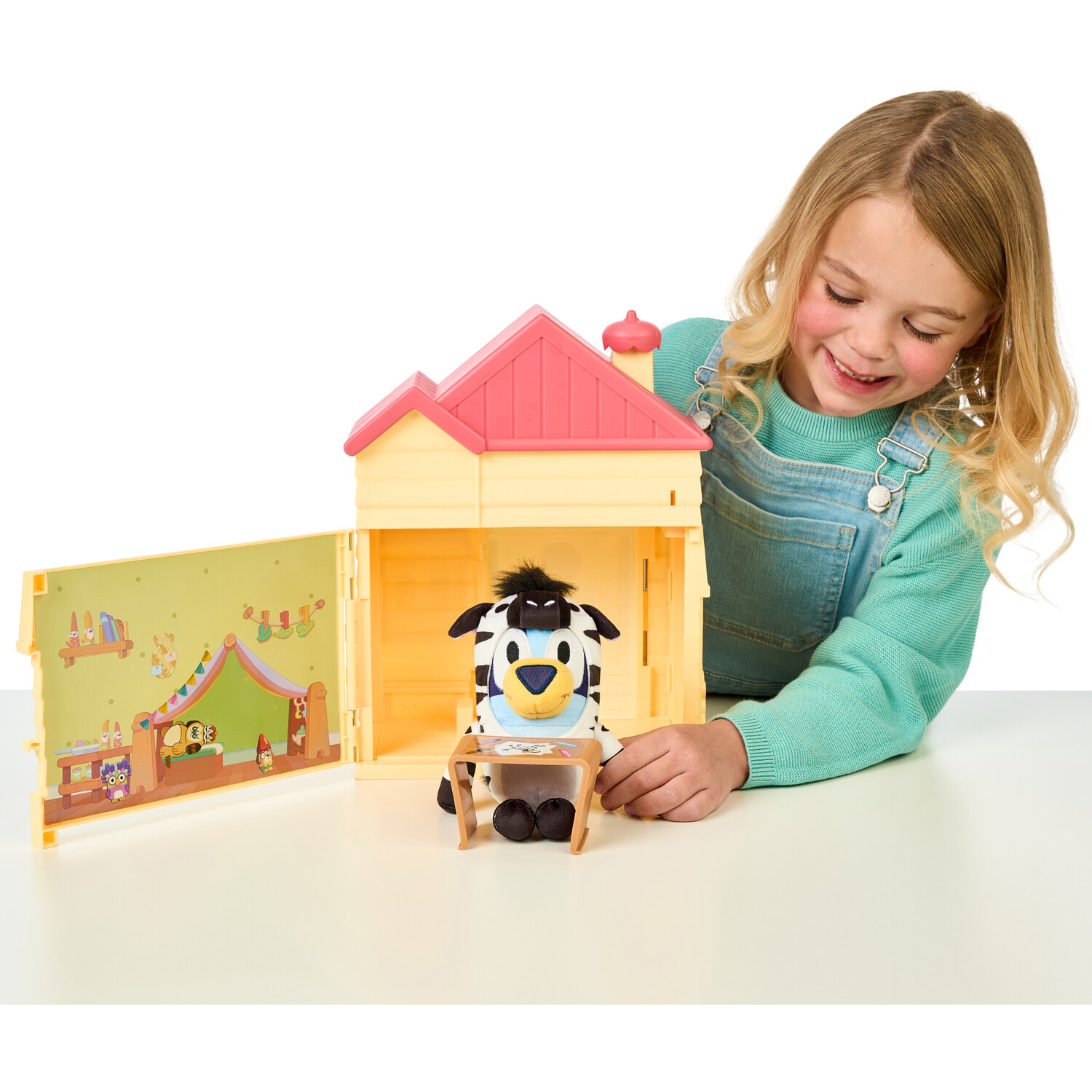 Delight Bluey fans with this Blueys Playdate Plush Surprise Playset. Inside the house, you'll find a gift box with a 'play time' sign and a sticker sheet to decorate with. Close the door, hang the sign, and knock again to reveal an amazing assortment of plush - a Queens Bluey or an Onesies Bluey. Perfect for sparking imaginative play, this playset is a must-have to keep your little one busy for hours.
