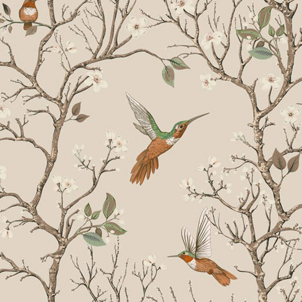 Uplift your living space in a classy way with this Eco Luxury Hummingbird Beige Wallpaper by Bobbi Beck. This wallpaper creates a classic look with this charming bird and branch design, perfect for rich, dark tones and soft pastel colour schemes. The wallpaper is made with eco-friendly luxury materials and water-based, non-toxic inks, which can be the ideal choice to enhance your decor. Roll Width: 75cm. Roll Height: 7m. Pattern Repeat: 75cm. Pattern Match: Straight Match. Application: Butt Joint.