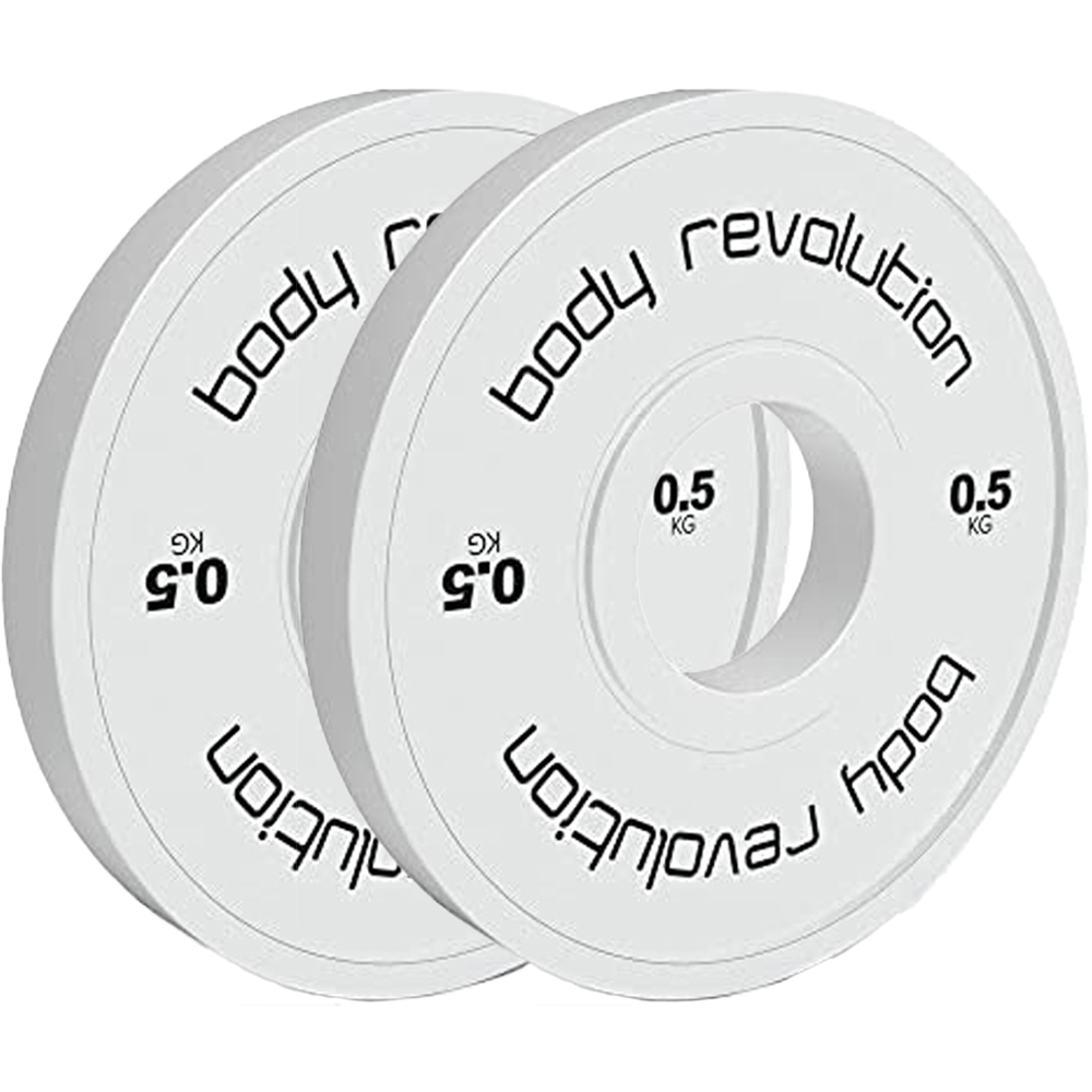 Achieve precision in your strength training with Body Revolution Fractional Weight Plates, designed to allow fine-tuned adjustments to your training load. These weight plates are perfect for those looking to add small increments for increased performance, progression, and enhanced control in their lifting routines. Made from solid rubber, these plates are durable and gentle on gym floors, protecting them from impact damage when dropped. Each plate is calibrated for accuracy, ensuring precise weight increments and consistent training results. The colour-coded design follows IWF standards, making it easy to differentiate between the weights: * 0.5kg (White) * 1kg (Green) * 1.5kg (Yellow) * 2kg (Blue) * 2.5kg (Red) Compatible with 2-inch Olympic barbells and dumbbells, these plates are ideal for athletes and gym enthusiasts who require incremental adjustments for specialized workouts. The weight plates are sold separately in singles or pairs, and also available in combination sets—perfect for fine-tuning your strength training progression.