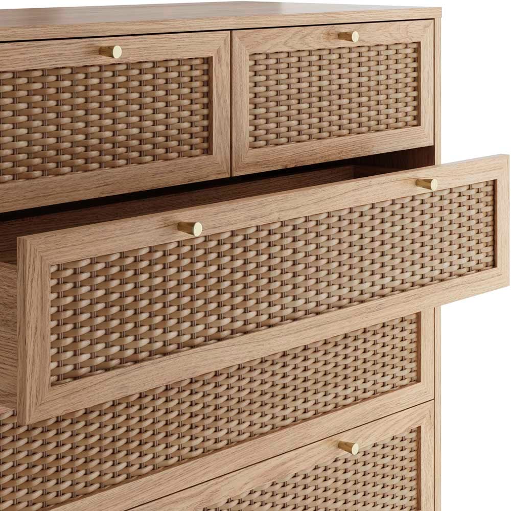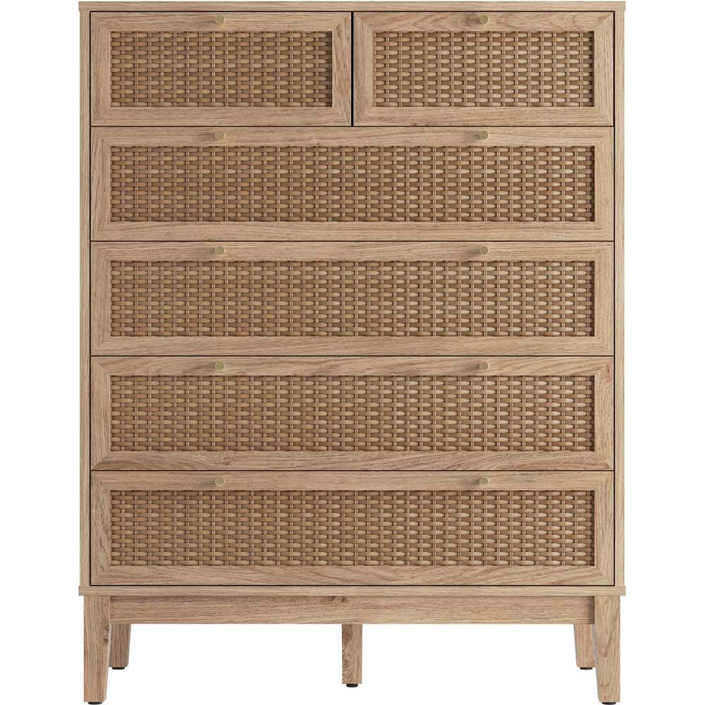 Declutter your space with this LPD Furniture Bordeaux 6 Drawer Oak Effect Storage Chest. The Bordeaux range will offer a modern yet boho vibe to your decor. This storage chest features wooden framed pieces with on-trend rattan fronts, complete with gold fittings and handles to add that little extra luxe detail. Also, it comes with six drawers for storing all your essentials.