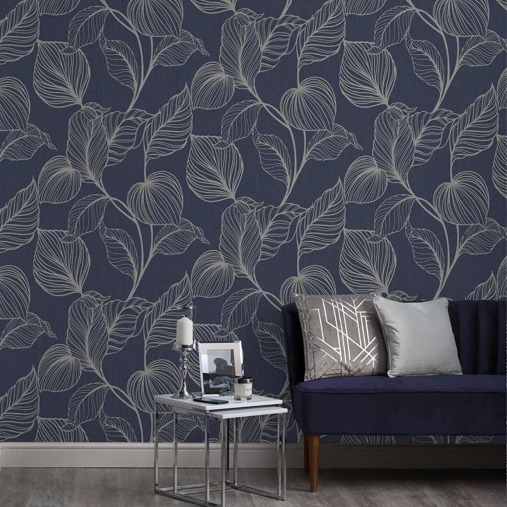 Add some dramatic personality to your home with the Boutique Royal Palm Sapphire wallpaper. A striking hosta like leaf on a woven backdrop and subtly enhanced with metallic highlights. Application: Paste the Wall. Design Match: Offset. Design Repeat: 64cm. Roll Length: 10m. Roll Width: 52cm