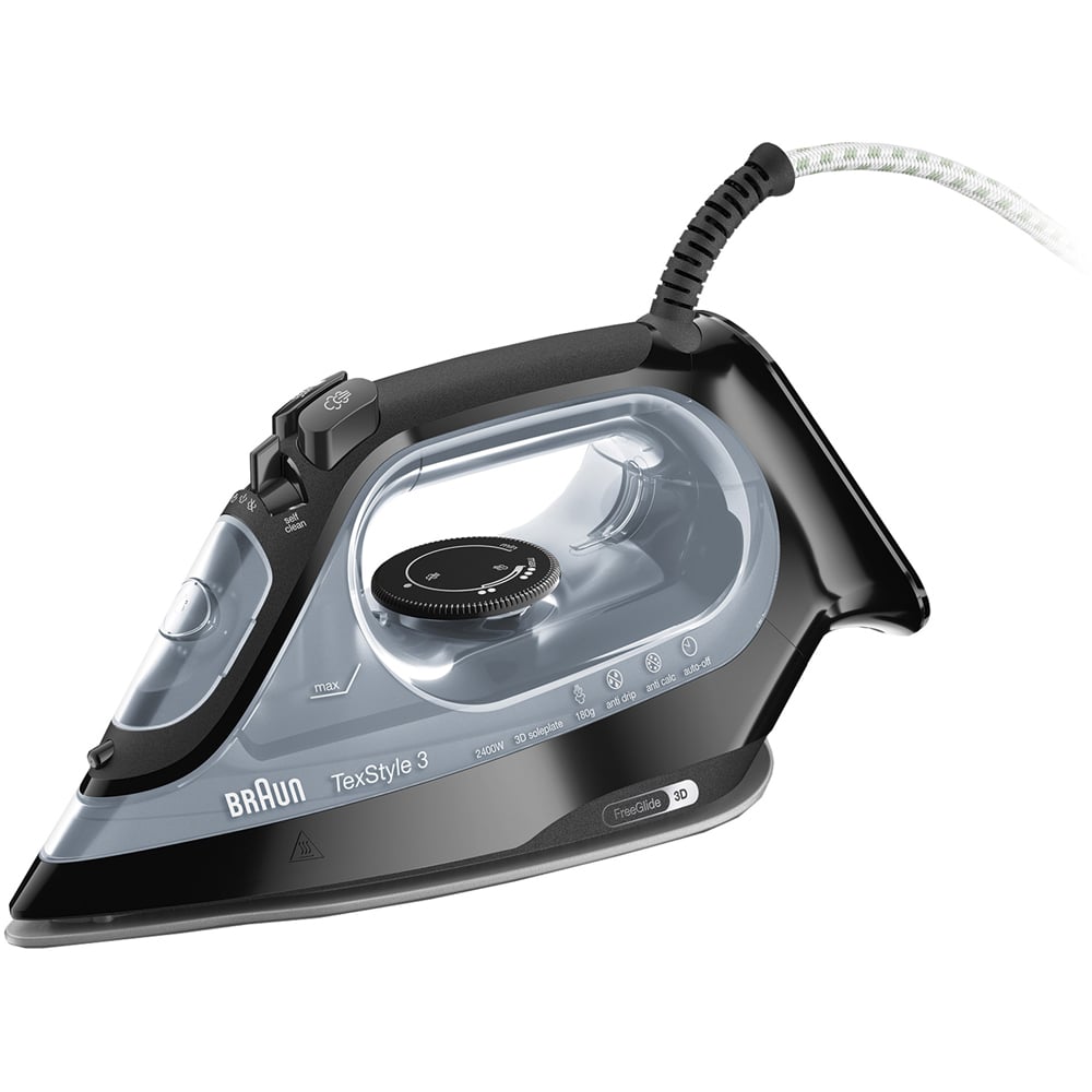 The BN3055 Steam Iron with Free Glide 3D technology from Braun offers effortless ironing with its patented upward-curving soleplate, guaranteeing 360° glide ability over any fabric or obstacle. Delivering up to 180g/min steam shot, it provides powerful wrinkle removal for even the most stubborn creases. Equipped with a 270ml water tank and a fast heat-up time of just 35 seconds, this iron is designed for quick and efficient performance. The auto shut-off feature ensures safety, while the soft-grip ergonomic handle adds comfort during use. With a precision tip for those hard-to-reach areas, the BN3055 is your ultimate tool for flawless ironing.