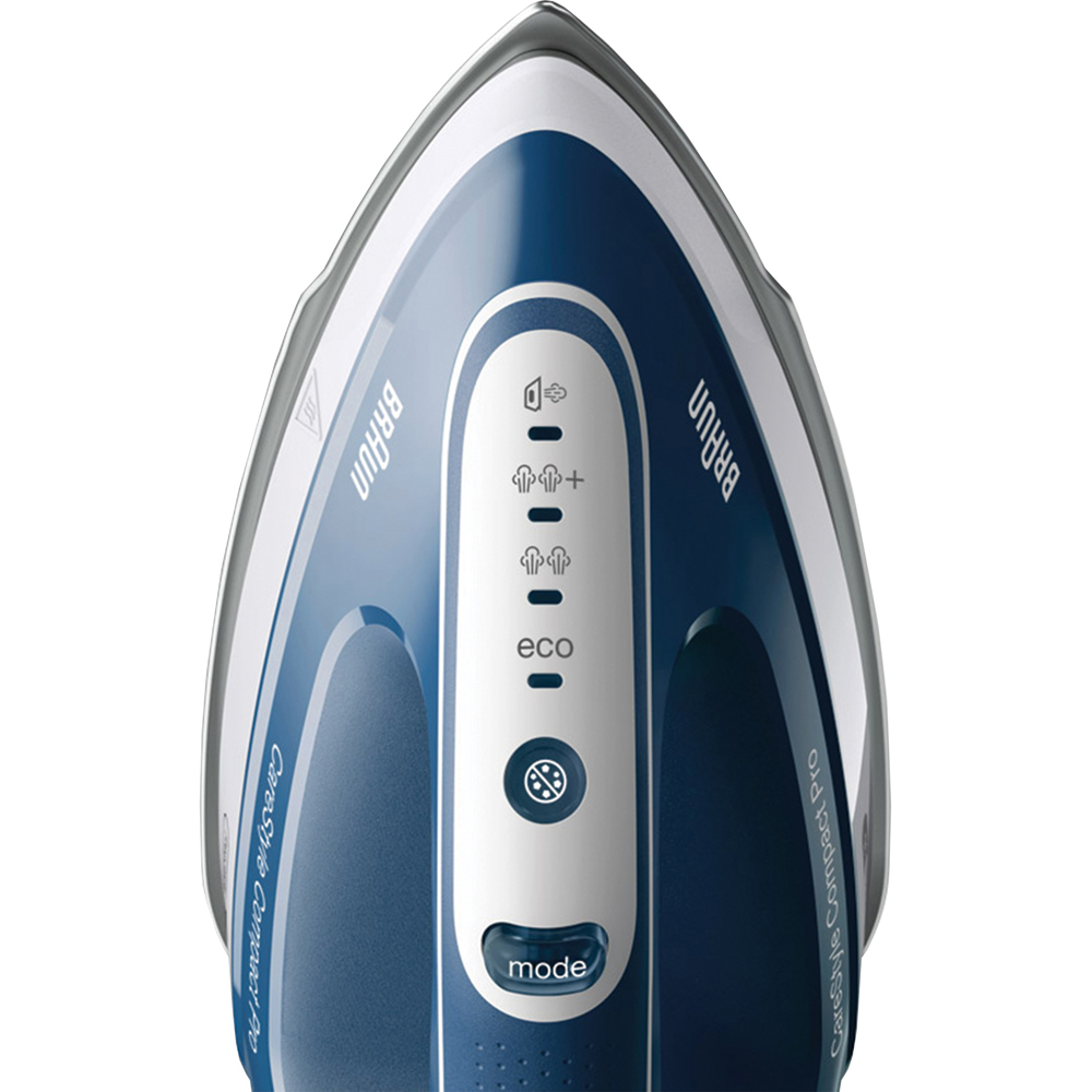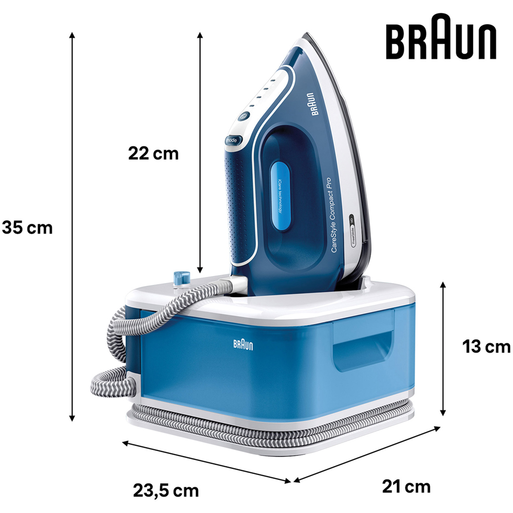 The Braun BN2565 Care Style Compact Pro Steam Generator Iron is a powerful, space-saving solution that combines efficiency and convenience. Designed to save 50% time and space, it delivers exceptional performance in a compact form, making it ideal for modern households. With its patented Free Glide 3D Technology, the upward-curving soleplate glides smoothly over fabrics and obstacles, providing 360° effortless movement for an outstanding ironing experience. This innovative model is equipped with four intuitive modes to meet diverse garment care needs. The Eco Mode is perfect for delicate fabrics and offers up to 25% energy savings without sacrificing results. The iCare Mode ensures a safe temperature setting for all fabrics, while the Turbo Mode provides maximum steam performance to tackle tough fabrics and stubborn creases. Thanks to iMode Technology, selecting the ideal mode is easy with a convenient mode selector at your fingertips. The BN2565 generates up to 430g/min of powerful steam shot to remove wrinkles effectively. Its 1.5-litre removable water tank supports extended ironing sessions, reducing the need for frequent refills. Features like anti-drip technology prevent water stains, and the Easy CalcClean system, complete with a reminder, simplifies maintenance for long-lasting performance. Combining robust functionality with space efficiency, the Braun BN2565 is a smart choice for effortless and precise ironing.