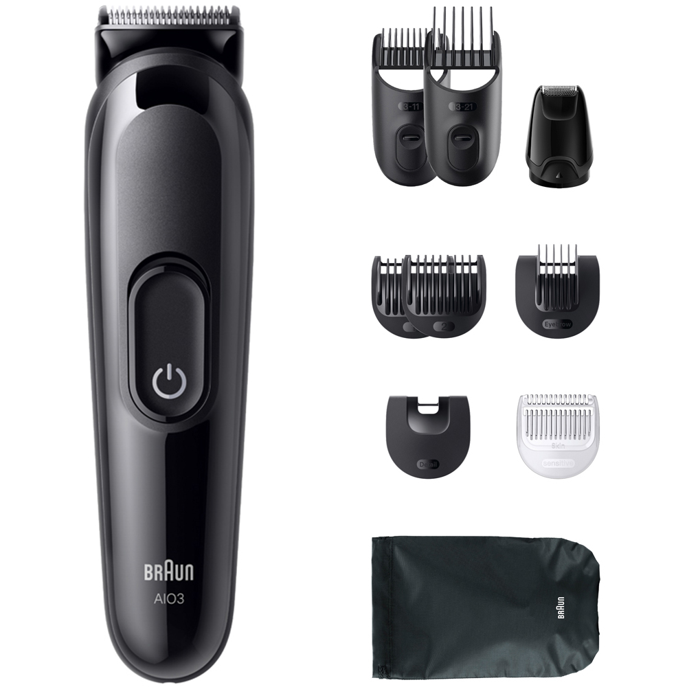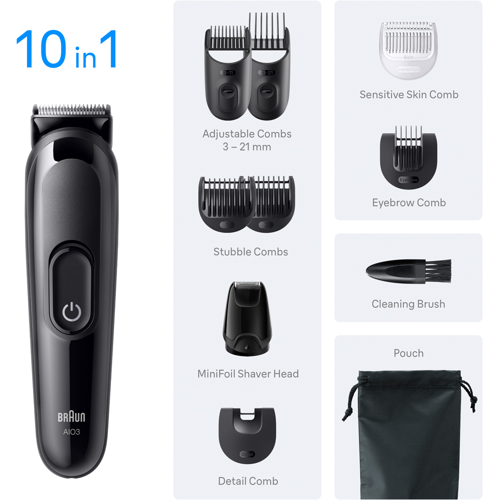 Upgrade your grooming game with Braun’s All-in-One Grooming Kit for men. The 10-in-1 Tool Kit lets you effortlessly trim your face and hair. Comfortably achieve precision and efficiency in no time with the Ultra Sharp Blade. Stay in full grooming control with 14 length settings. Includes washable heads and combs, and a cleaning brush for quick and effortless cleaning. Braun AIO Series 3, built to last, 50-minute runtime. Easy and fast styling: Braun’s 10 in 1 All-in-One Grooming Kit includes curated tools for beard trimming and hair clipping. Always great results: The ultra-sharp blade helps achieve perfect finishes and brings comfort to grooming your beard and face. Full control: Beard trimmer includes 14 lengths (3 to 21 mm) for trimming versatility. Ready to use: Trimmer for men with 50-minute cordless runtime. Effortless cleaning: The Beard trimmer kit comes with washable heads, combs, a cleaning brush and a pouch.