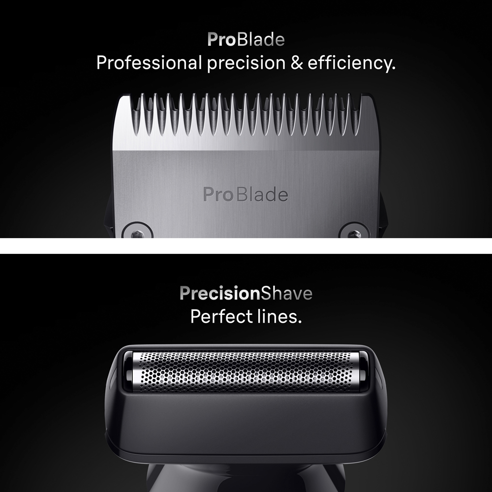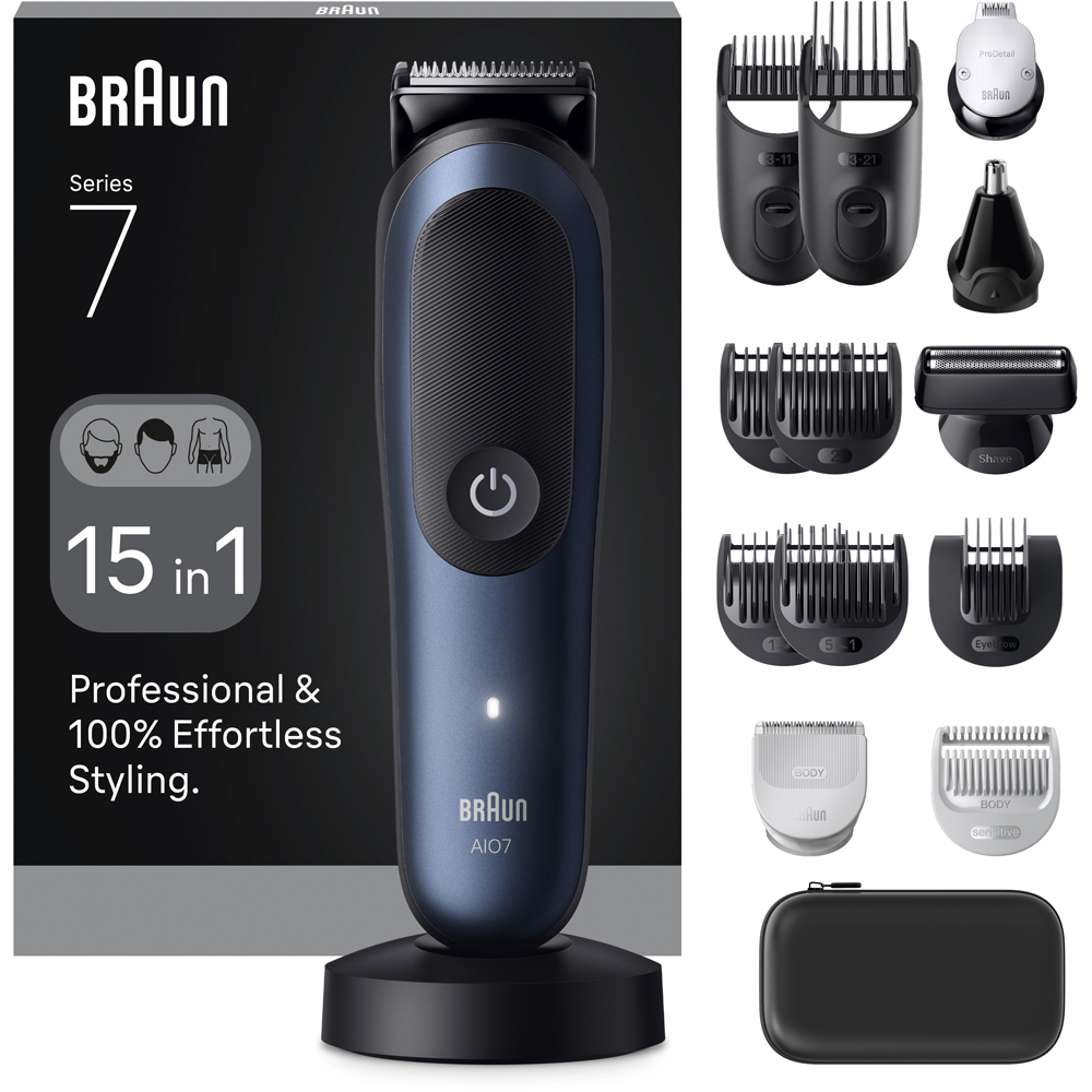 Upgrade your grooming game with Braun’s best All-in-One Grooming Kit for men. The 15 in 1 Tool Kit lets you effortlessly trim your beard, ears, nose, clip your hair and groom your whole body. Achieve precision with the Ultra Sharp ProBlade on any beard with AutoSense Technology. Get a precise shave and perfect lines with the PrecisionShave head. 14 length settings and AquaGrip for underwater use give full control. AIO Series 7 is built to last, waterproof, and with up to 120-minute runtime Li-Ion battery. Professional and 100% effortless styling: Braun’s 15 in 1 Kit for head-to-toe grooming with curated tools for beard, ear and nose trimming, hair clipping and body manscaping. Ultimate precision: Achieve effortless styling with the Ultra Sharp ProBlade and maximum efficiency for any beard thanks to Autosense Technology. Unlimited versatility: Get perfect lines and clean shaves with the PrecisionShave head. Beard trimmer includes 14 lengths (3–21 mm). Gentle on sensitive skin: Groom with SkinGuard technology, designed for maximum safety and comfort even on sensitive body areas. Built to last: 100% waterproof with AquaGrip for control even under the shower. Long-lasting Li-Ion battery for up to 120 minutes of cordless runtime.