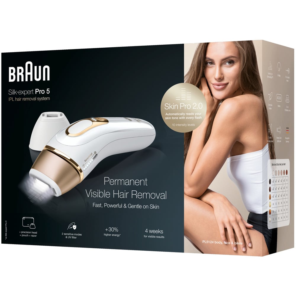 Treat your legs, arms, chest, back, face, underarms and even the pubic areas with dedicated heads with Braun IPL Silk-expert Pro 5. Braun IPL Silk-Expert Pro 5 PL5124 Gold isn’t a laser hair removal device but instead uses advanced IPL technology to give you one year of smooth skin with visible results in just three weeks. The Skin Pro 2.0 sensor (SensoAdapt TM) automatically adapts to your skin tone, optimizing the power for the perfect balance between fast results and gentleness on the skin. Three intensity modes ensure your skin’s comfort. Up to 125 flashes per minute enable fewer missed spots when gliding on your skin. Comfortable and virtually painless even in sensitive areas thanks to three intensity modes. UV filtered. Box content: 1x Silk-expert Pro 5 with standard head, 1x Precision head, 1x Venus razor and 1x Pouch.