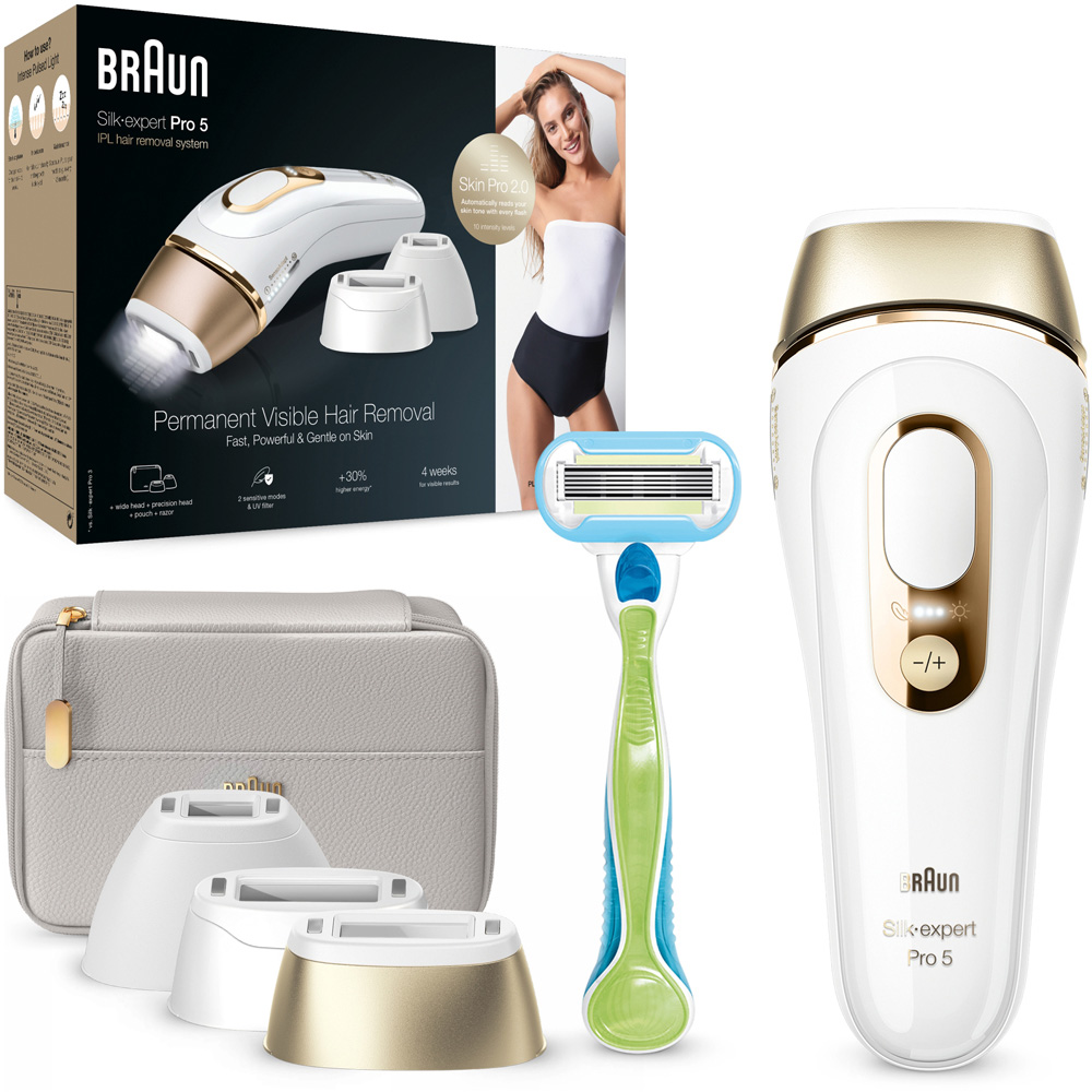 Say goodbye to unwanted body hair with this Braun PL5257 Silk-Expert Pro 5 IPL in golden colour. This is not a laser hair removal device but uses advanced IPL technology to give you one year of smooth skin with visible results in just three weeks. Its skin pro 2.0 sensor (SensoAdapt TM) automatically adapts to your skin tone, optimizing the power for the perfect balance between fast results and gentleness on the skin. With three intensity modes, it ensures skin comfort and painless hair removal even in sensitive areas. Also, with up to 125 flashes per minute, the device enables fewer missed spots when gliding on your skin. This device treats the legs, arms, chest, back, face, underarms and even the pubic areas with dedicated heads. The box contains 1 x Silk·expert Pro 5 with standard head, 1 x precision head, 1 x wide head, 1 x Venus razor and 1 x pouch. Please note: Individual results may vary.