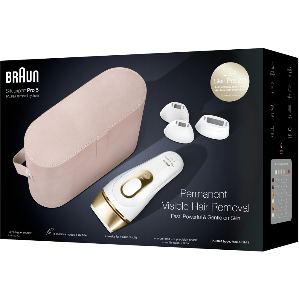 Say goodbye to unwanted body hair with this Braun PL5347 Silk-Expert Pro 5 IPL in golden colour. This is not a laser hair removal device but uses advanced IPL technology to give you one year of smooth skin with visible results in just three weeks. Its skin pro 2.0 sensor (SensoAdapt TM) automatically adapts to your skin tone, optimizing the power for the perfect balance between fast results and gentleness on the skin. With three intensity modes, it ensures skin comfort and painless hair removal even in sensitive areas. Also, with up to 125 flashes per minute, the device enables fewer missed spots when gliding on your skin. This device treats the legs, arms, chest, back, face, underarms and even the pubic areas with dedicated heads. The box contains 1 x Silk·expert Pro 5 with standard head, 2 x precision head, 1 x wide head, 1 x Venus razor and 1 x vanity case. Please note: Individual results may vary.