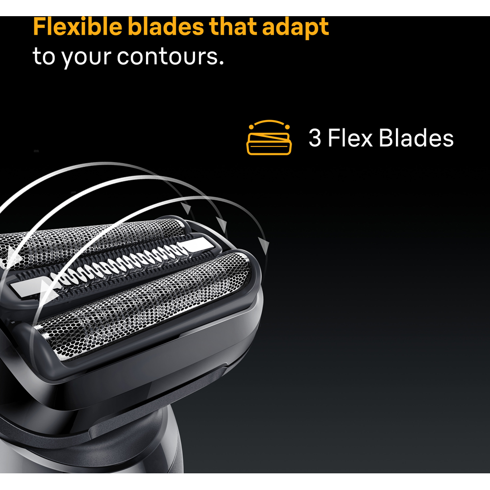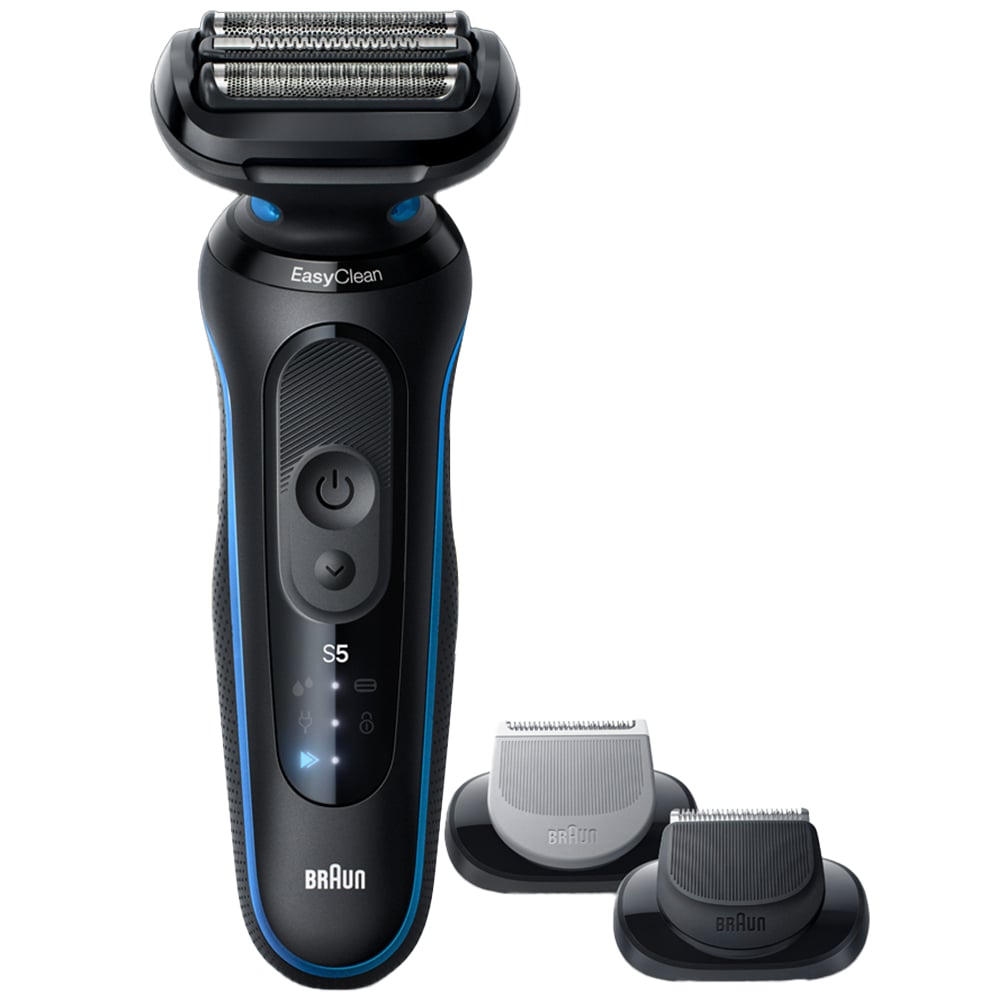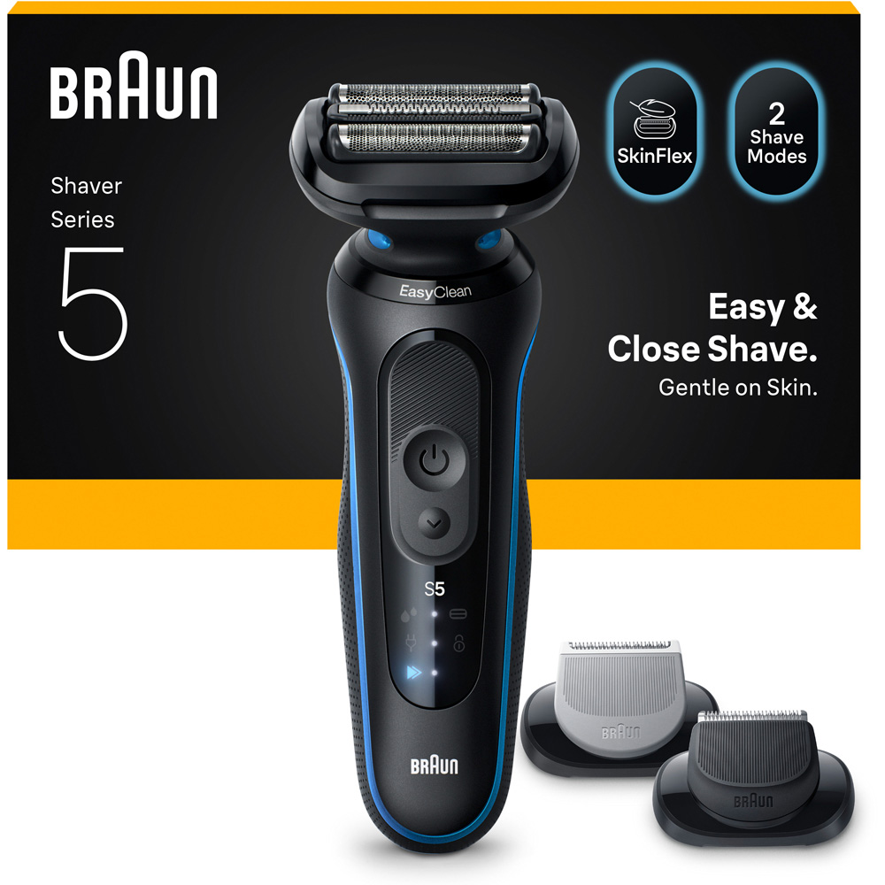 Upgrade your grooming routine with the Braun Series 5 electric shaver, which offers an easy and fast shave. The 3 Flex blades adapt to comfortably follow the contours of your face. 2 shave modes: Turbo Mode and Standard Mode, allow you to personalise your shave to your needs. With a Li-Ion battery offering up to 50 minutes of cordless runtime and a 5-minute quick charge. The Series 5 electric razor for men is 100% waterproof. Made in Germany. Box content: 1x Braun Series 5 shaver, 1x travel case, 1x charger, 1x cleaning brush, 1x cleaning brush, 1x Body Groomer attachment, 1x Beard Trimmer attachment Easy and fast shave: Braun's Series 5 electric shaver offers an easy and fast shave that is gentle on skin 3 Flex blades: 3 Flex blades adapt to comfortably follow the contours of your face Shave modes: Braun Series 5 has 2 shave modes. Turbo for an extra fast shave and Standard for the optimal balance between quick and gentle. Complete Grooming Kit: Bring your grooming routine to the next level with Body Groomer and Beard Trimmer attachments for versatile grooming and styling. Made in Germany, built to last for years: The shaver is 100% waterproof for wet and dry use. Up to 50-minute Li-Ion battery runtime and 5-minute quick charge for one shave.