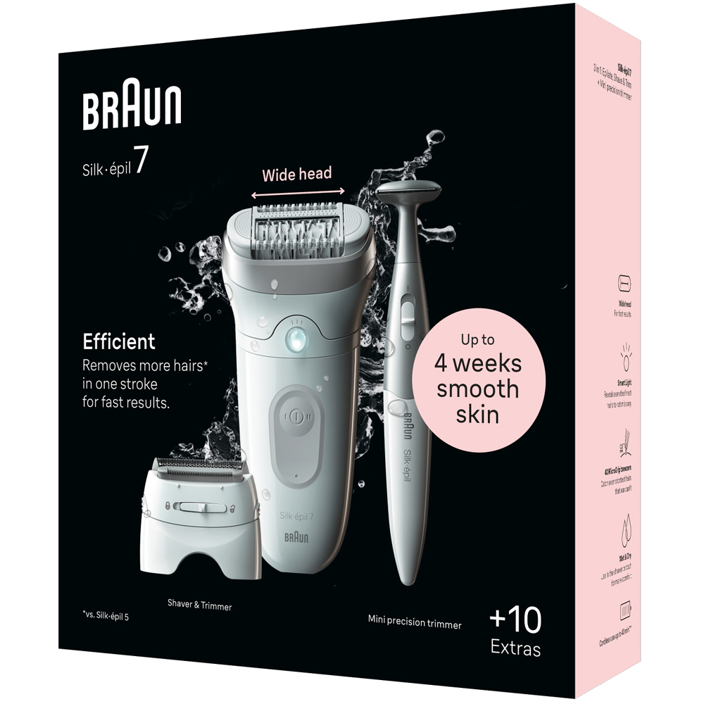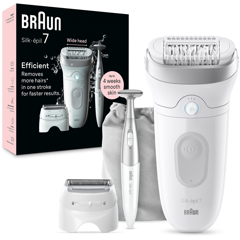 Make your skincare routine convenient and get instant hair removal with the Braun Silk-epil 7 7-241 Epilator. This compact epilator features wide, wet and dry epilator heads that cover large areas capturing more hair in each stroke. It has MicroGrip tweezer technology that captures and removes hairs as short as 0.5mm. It also features a massage roller cap that ensures you experience less pain sensation. This cordless epilator is designed for convenience and ensures up to one month of smooth skin, eliminating the need for clean-ups or appointments. It is ideal for dry and wet usage, and you can gently epilate in the bath or shower under warm water for reduced pain sensation. It includes a bikini trimmer, lady shaver head and trimmer comb for sensitive areas with a soft pouch for carrying purposes. Avoid the inconvenience of using hair removal products such as wax and make your skincare routine convenient with this chemical-free epilator made in Germany.