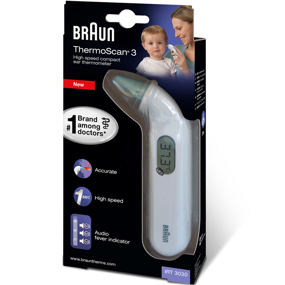 Discover the simplicity of temperature checking with the Braun ThermoScan 3 Compact Ear Thermometer. A versatile device suitable for adults and children alike, it offers lightning-fast results in just 1 second, making it perfect for busy parents. This thermometer goes in the ear with the hygiene cap, so you don't have to worry about hygiene. Gentle and accurate, it features hygienic disposable lens filters and audio guidance features. One beep indicates normal temperature, two beeps mean elevated temperature and four beeps indicate high temperature. With this reliable thermometer, you can discover the simplicity of temperature checking.