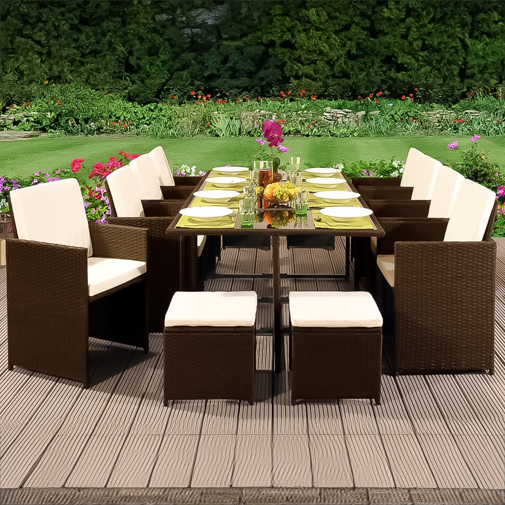 Elevate your outdoor garden space with Brooklyn 12 Seater Rattan Cube Garden Dining Set Gold with Cover. It includes eight comfortable armchairs with padded cushioned seating and backrests, four footstools and a dining table with a tempered glass top and interwoven frame finish. This furniture set can be easily packed away when not in use for space-saving. The footstools neatly store away under the chairs and the chair backrests fold forward to be tucked under the table to form a cube. The seat cushions are designed to resist the elements with showerproof covers that are removable and machine washable. Protect your garden furniture with our durable and waterproof covers. Explore our wide range of heavy-duty Garden Furniture covers to find the perfect fit for your needs.