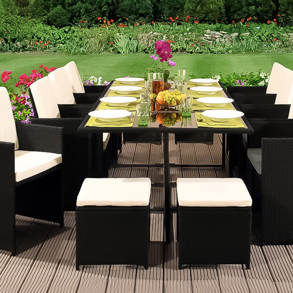 Elevate your outdoor garden space with Brooklyn 12 Seater Rattan Cube Garden Dining Set with Cover Black. It includes eight comfortable armchairs with padded cushioned seating and backrests, four footstools and a dining table with a tempered glass top and interwoven frame finish. This furniture set can be easily packed away when not in use for space-saving. The footstools neatly store away under the chairs and the chair backrests fold forward to be tucked under the table to form a cube. The seat cushions are designed to resist the elements with showerproof covers that are removable and machine washable. Protect your garden furniture with our durable and waterproof covers. Explore our wide range of heavy-duty Garden Furniture covers to find the perfect fit for your needs.