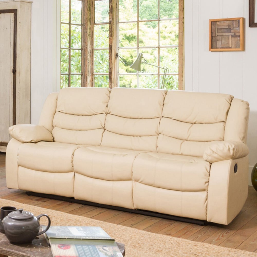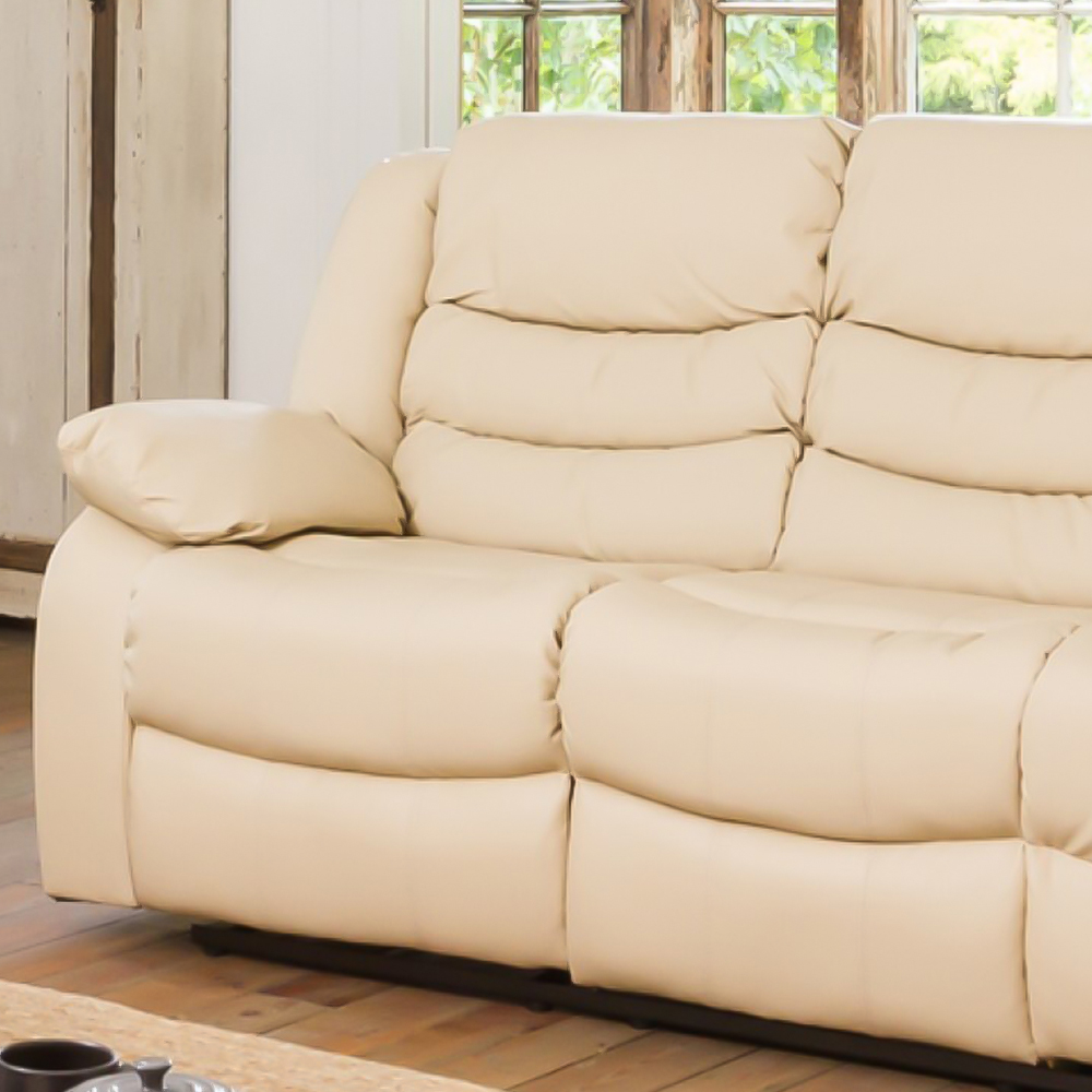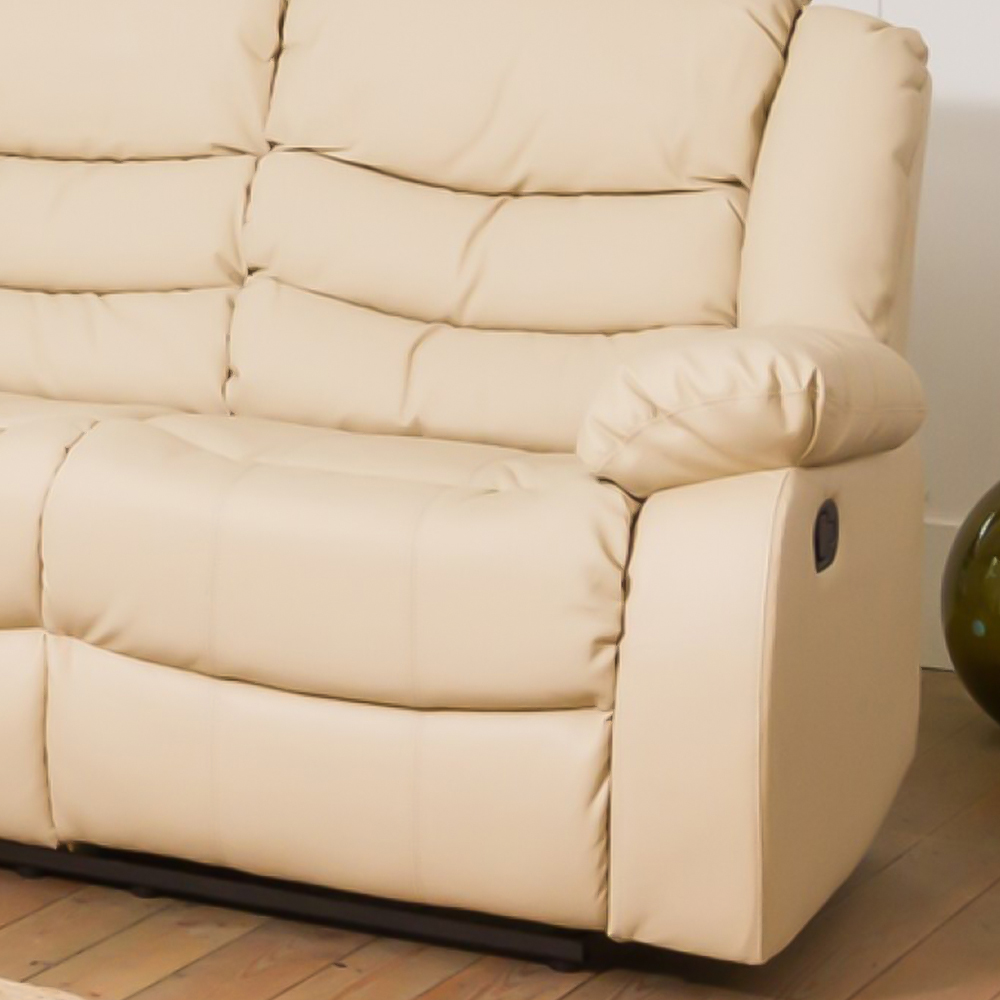 Add comfort and style to your living room with this Brooklyn 3 Seater Cream Manual Recliner Sofa. This incredibly comfortable sofa will allow you to relax perfectly after a hectic and tiring day. It is constructed from a hardwood frame with a robust metal recliner mechanism. The sofa is made from foam for comfort, and the seat's feature pocket sprung to balance comfort and support. It is covered in durable bonded leather with a faux leather match used on the lower-stress areas - including the side and back of the suite. This manually operated recliner sofa also has soft yet supportive cushions. Its elegant look and comfort make it a perfect addition to your home decor.