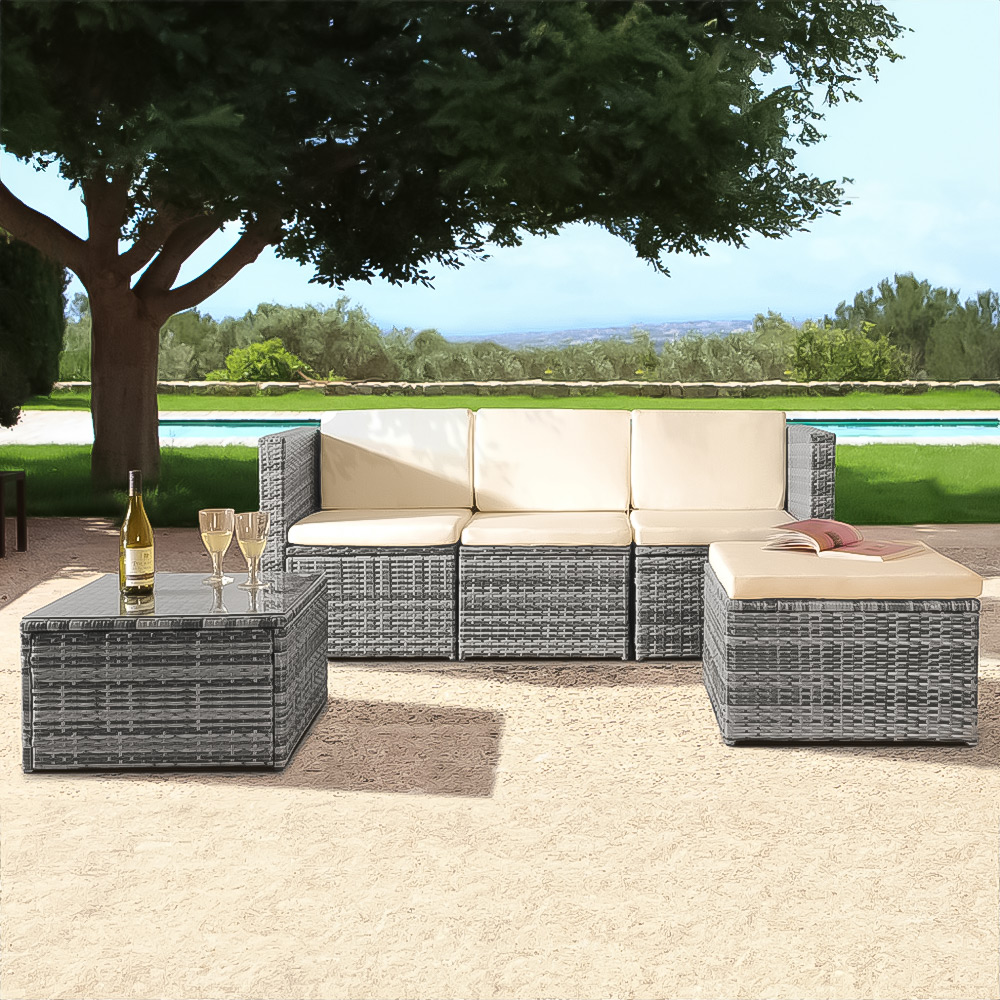 Add a touch of modern elegance to your garden with the Brooklyn 3 Seater Light Grey Rattan Garden Sofa Set. With a sleek cube design, this set effortlessly combines style with functionality. The 3 seater sofa set includes a cushioned ottoman footstool that can be used as extra seating and a glass-topped coffee table. The cream colour seat cushions come with machine washable covers, ensuring both comfort and durability. Elevate your outdoor living experience with this elegant and practical garden sofa set. Protect your garden furniture with our durable and waterproof covers. Explore our wide range of heavy-duty Garden Furniture covers to find the perfect fit for your needs.