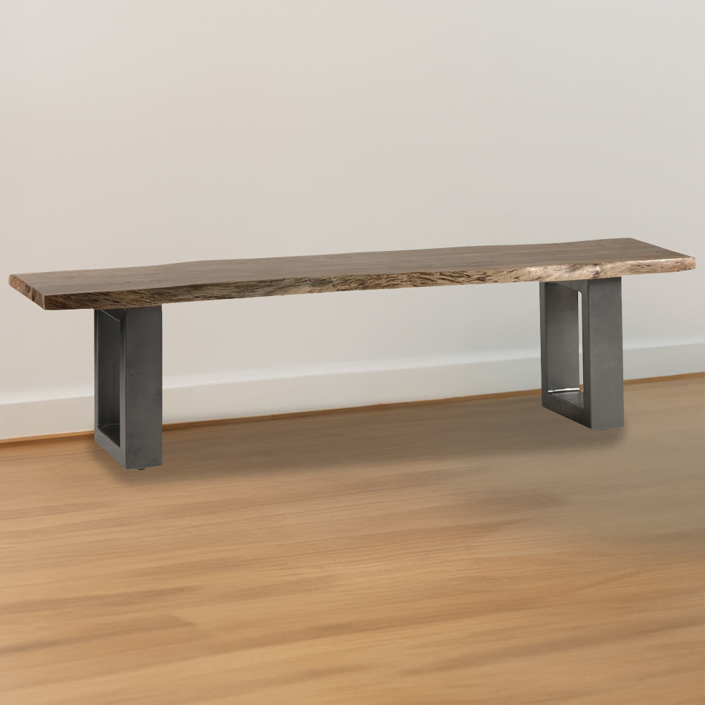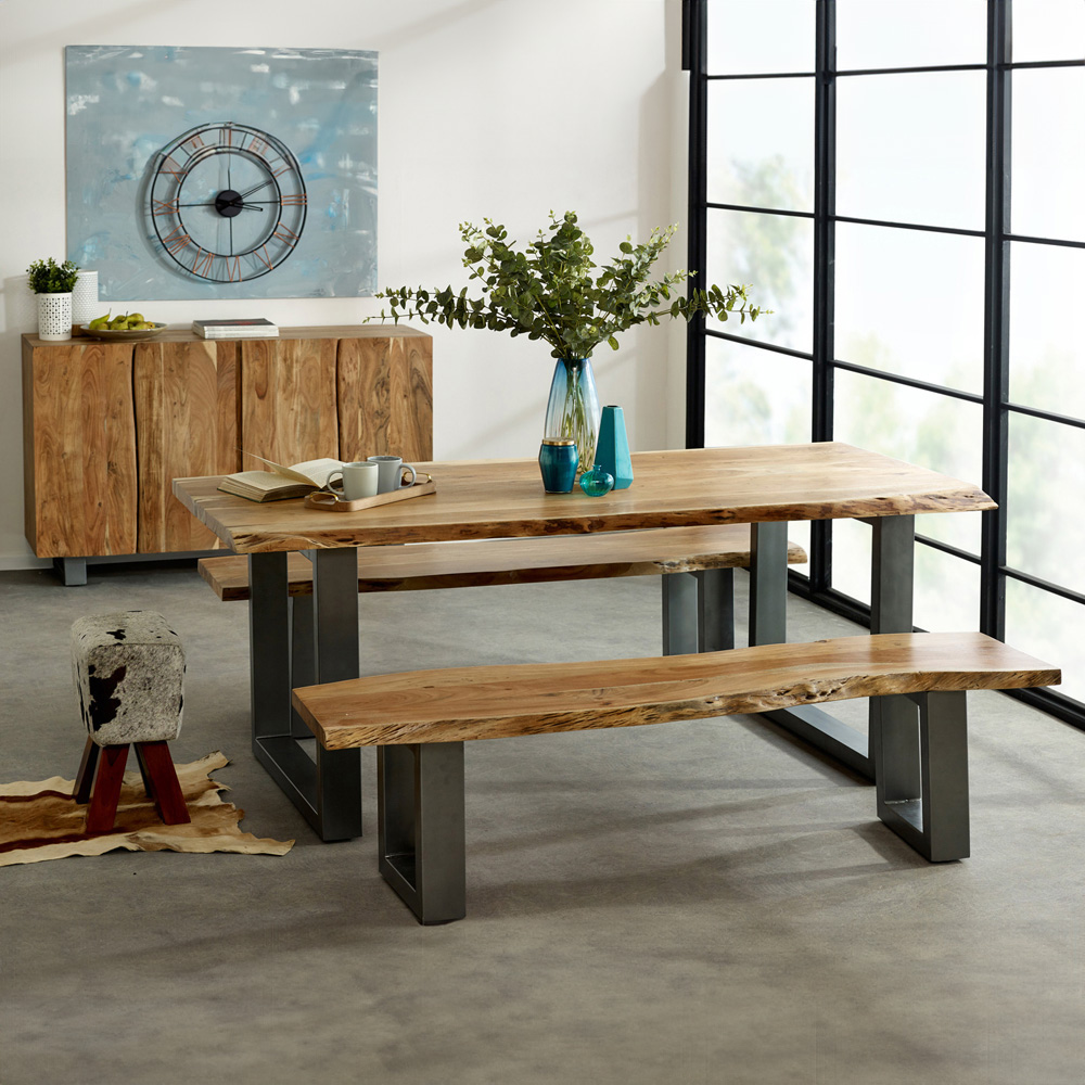 Elevate your dining space with the Brooklyn Barima 3 Seater Wooden Dining Bench. The key feature of the range is represented by the live edges of the table tops, following the natural shape of the wood, complemented with sturdy metal frame legs, sled-shaped.