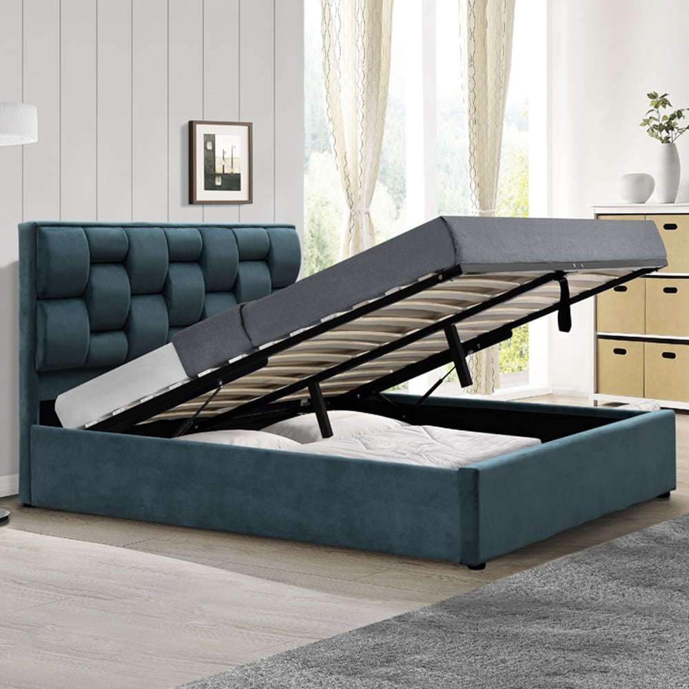 This stylish Brooklyn King Size Blue Plush Velvet Weaved Headboard Storage Ottoman Bed Frame With 2 Bedside Tables is beautifully upholstered in a blue plush velvet. It features a unique weaved effect padded headboard. It is made from a solid wooden frame and has a sprung slatted base to give support to the mattress and give you a fully supportive and comfortable night's sleep. The ottoman aspect of this bed frame is operated using a gas lift mechanism that lifts up the mattress to reveal ample storage space. This bed frame is accompanied by 2 stunning upholstered bed side tables.