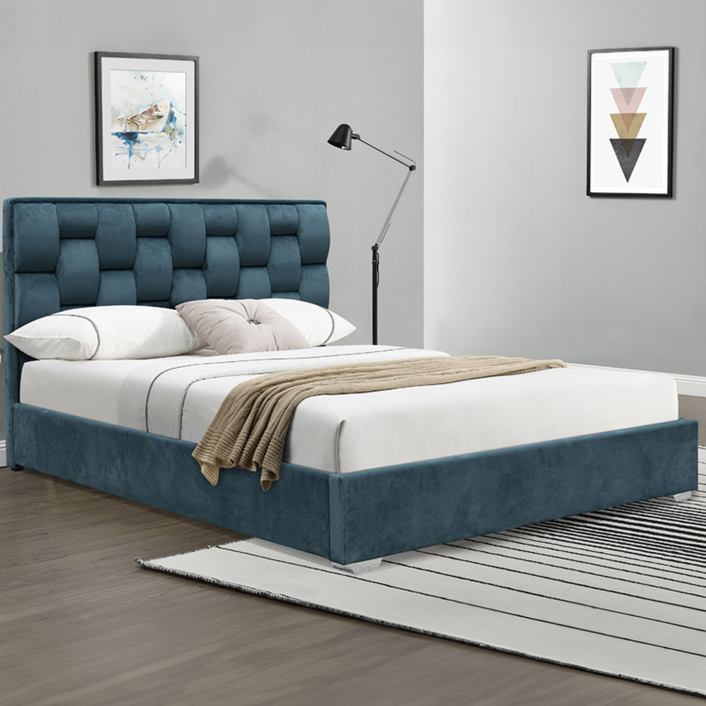 Uplift the look in your bedroom with the stylish Brooklyn double bed beautifully upholstered in a blue plush velvet. It features a unique weaved effect padded headboard. It is made from a solid wooden frame and has a sprung slatted base to support the mattress and give you a fully supportive and comfortable night's sleep. This bed frame is accompanied by 2 stunning upholstered bedside tables and a blanket box
