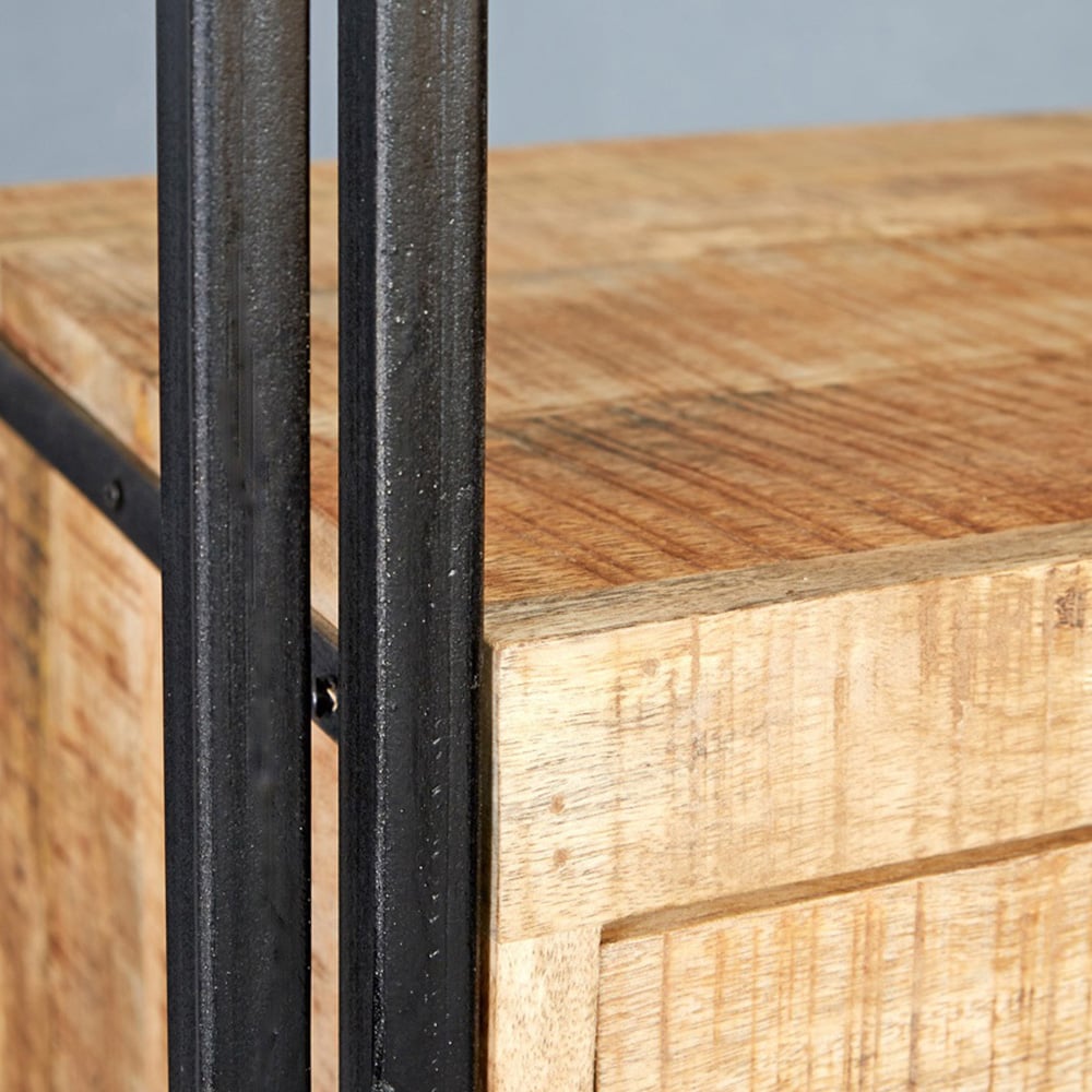 Up-cycled Reclaimed Industrial TV Cabinet featuring wood and metal and two drawers. The light-grain hardwood is left in its natural state and colour with natural variations and slight cracking with a banded iron edge.